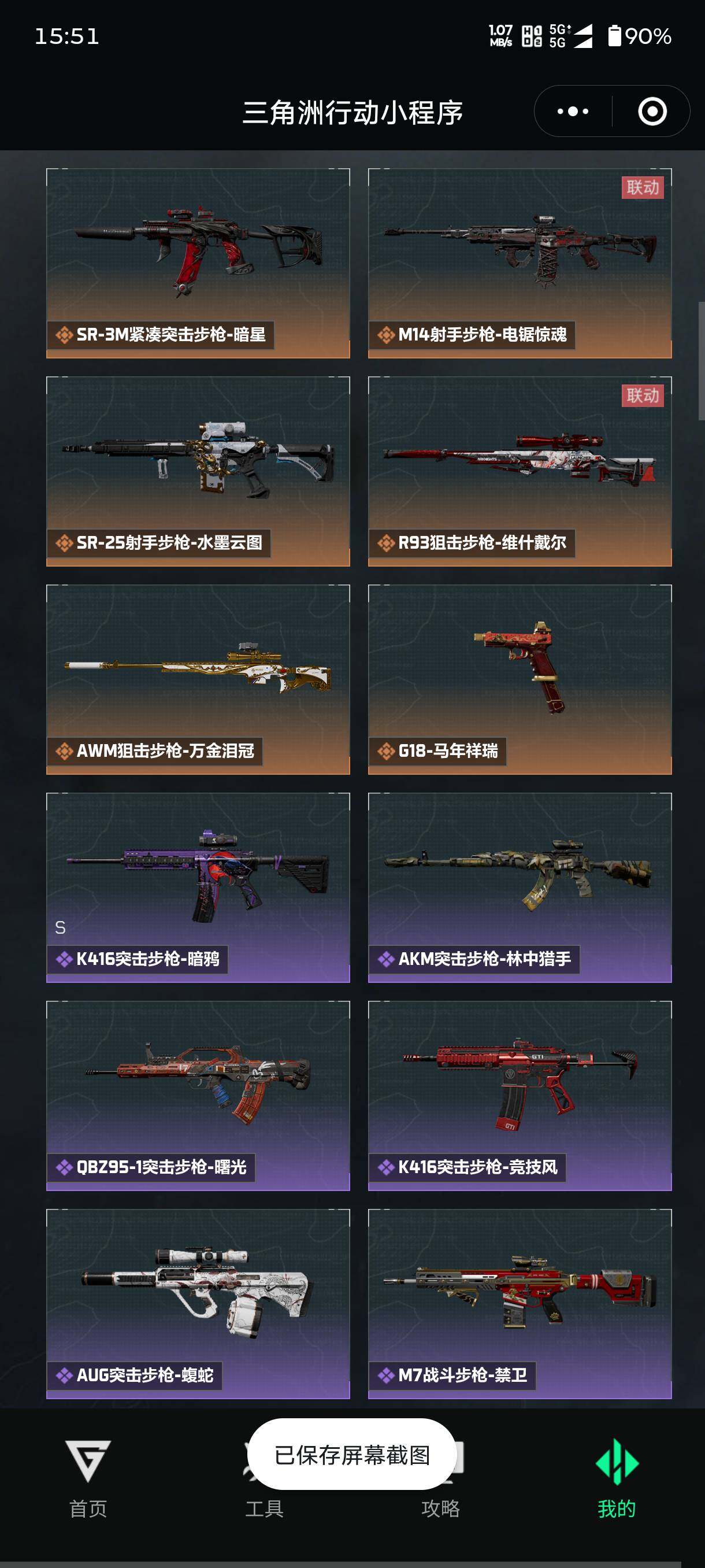【传说外观】:AUG突击步枪-悠然茶歇,SCAR-H战斗步枪-启航,腾龙突击步枪-马年祥瑞,腾龙突击步枪-万金泪冠,MK47突击步枪-悠然茶歇,MK47突击步枪-暗星,UZI冲锋枪-悠然茶歇,SMG-4
