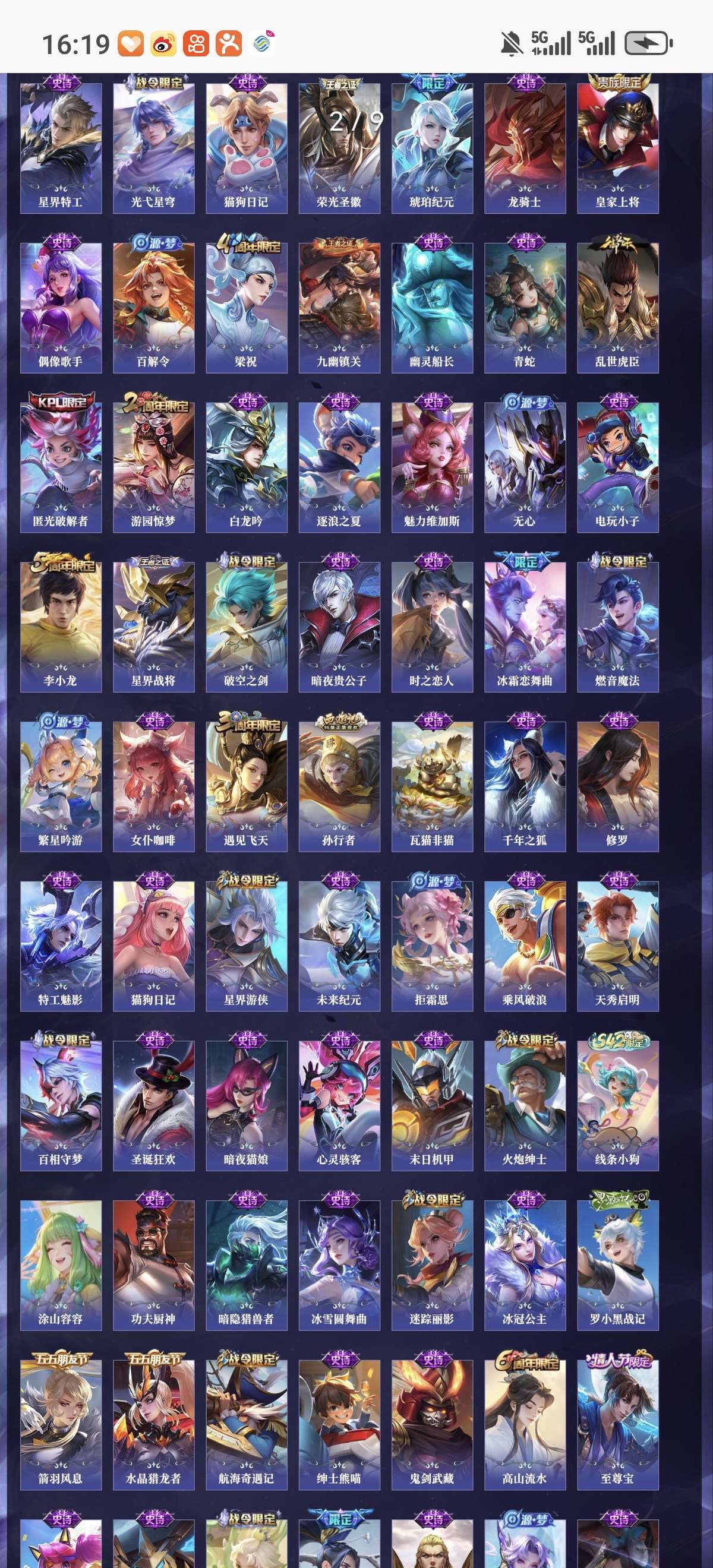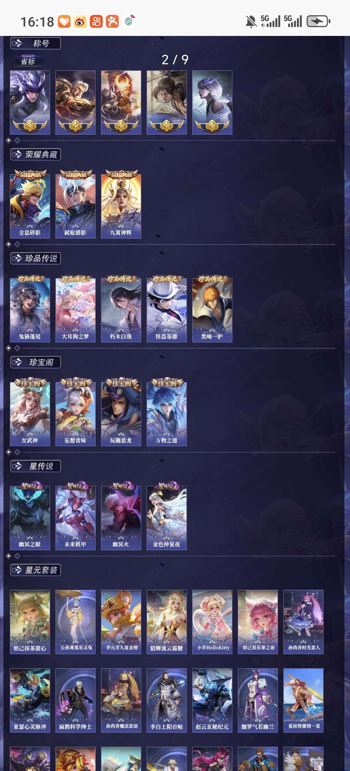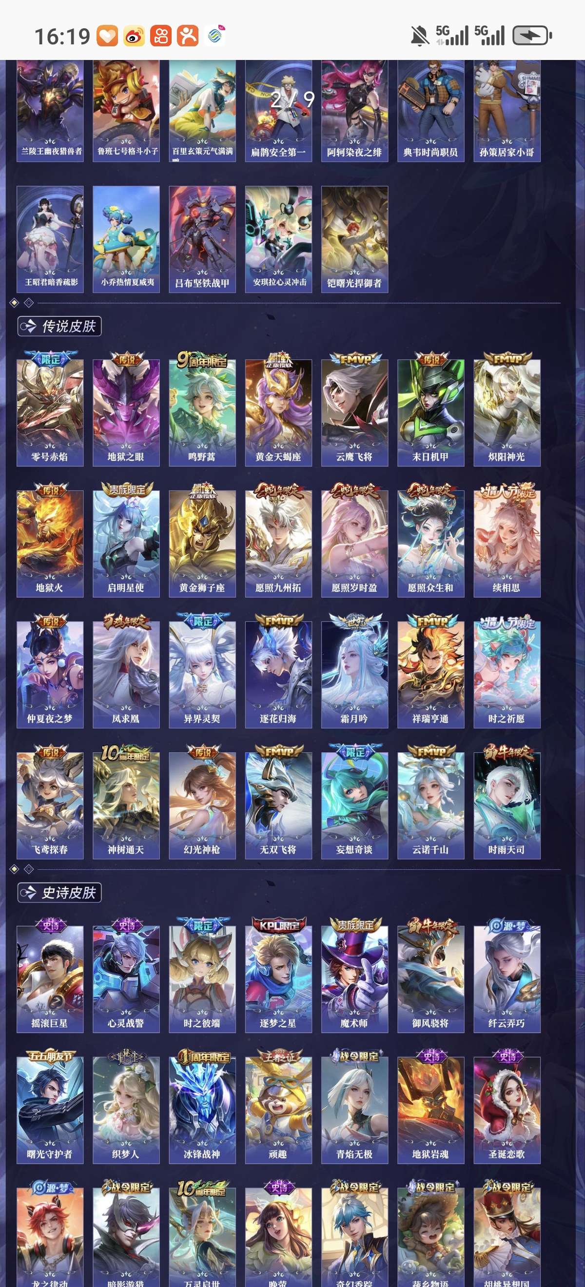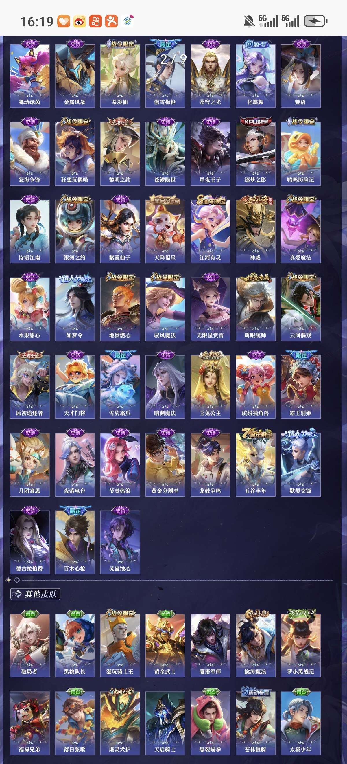 省标5 贵族9 荣耀典藏3 珍品传说5 星元皮肤4 传说皮肤28