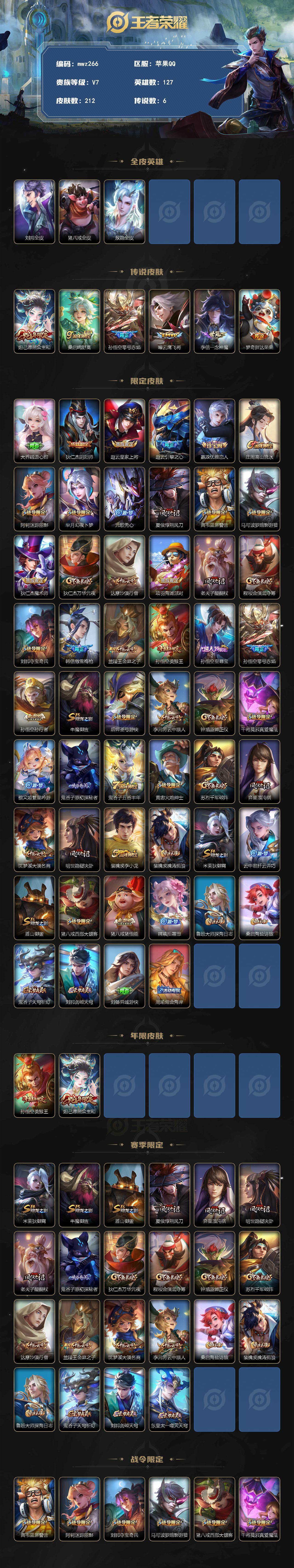 【mwz266】苹果Q-V7-至尊星耀II段位-127英雄-212皮肤-6传说