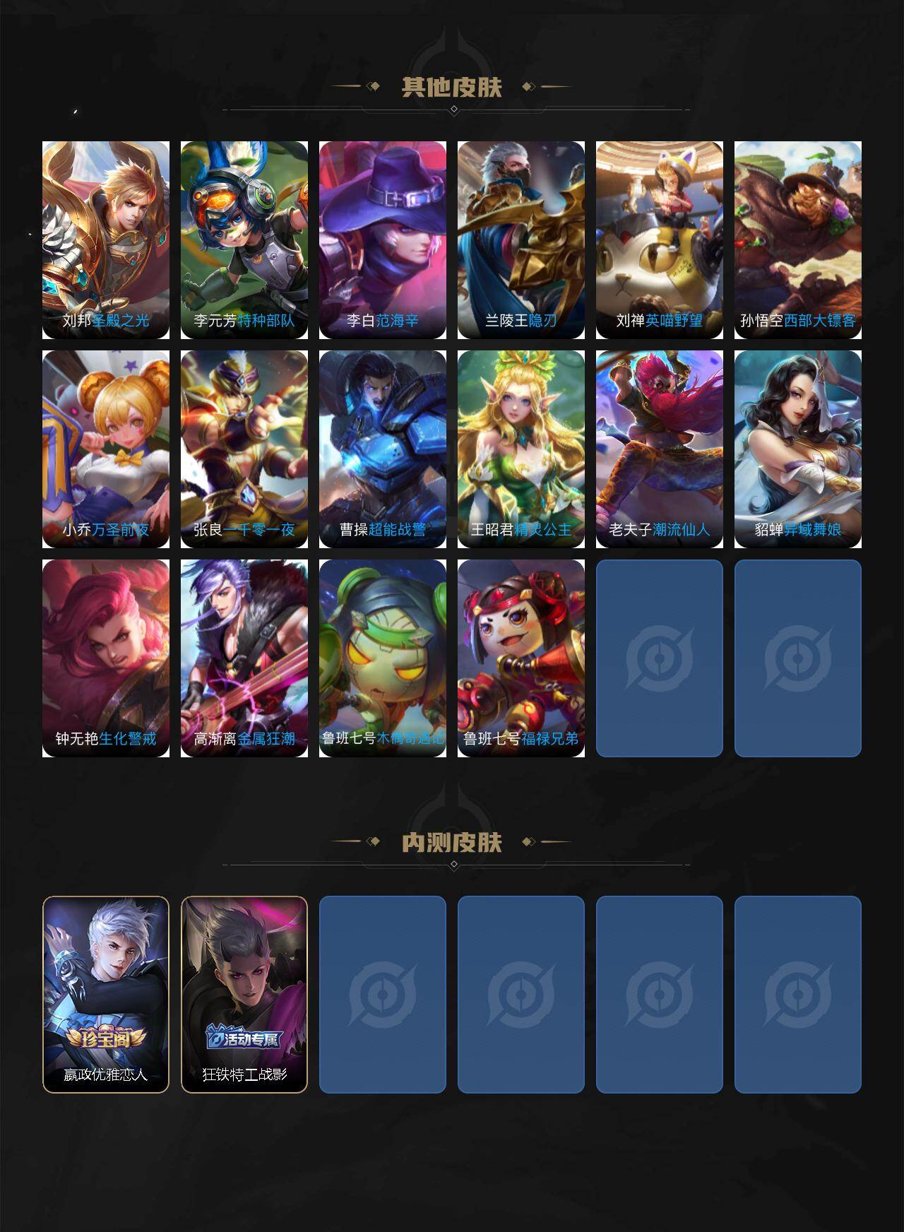 【限定皮肤】:大乔绒语心约,狄仁杰阴阳师,赵云皇家上将,赵云引擎之心,嬴政优雅恋人,庄周高山流水,阿轲迷踪丽影,芈月幻夜卜梦,元歌无心