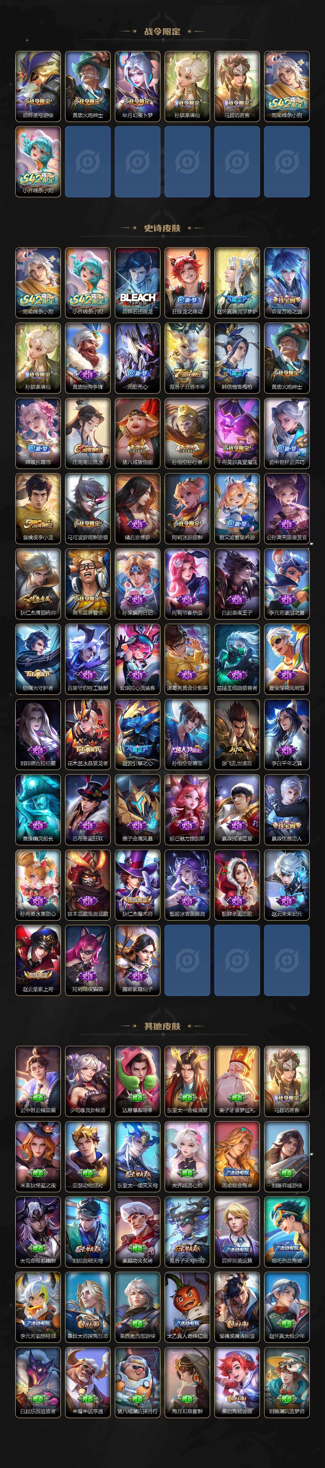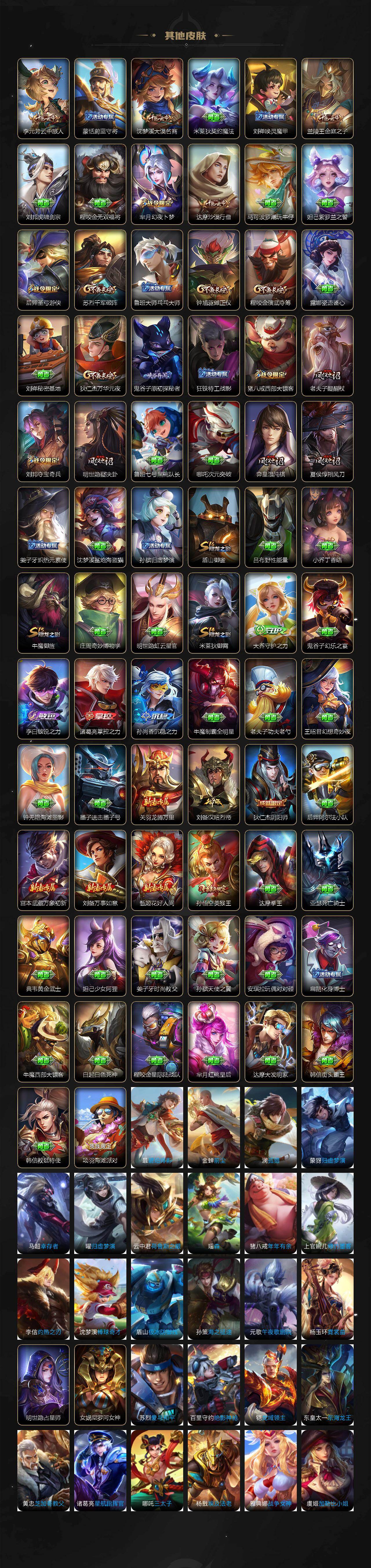 【传说皮肤】:妲己愿照众生和,桑启鸣野蒿,孙悟空零号赤焰,曜云鹰飞将,李信一念神魔,梦奇胖达荣荣