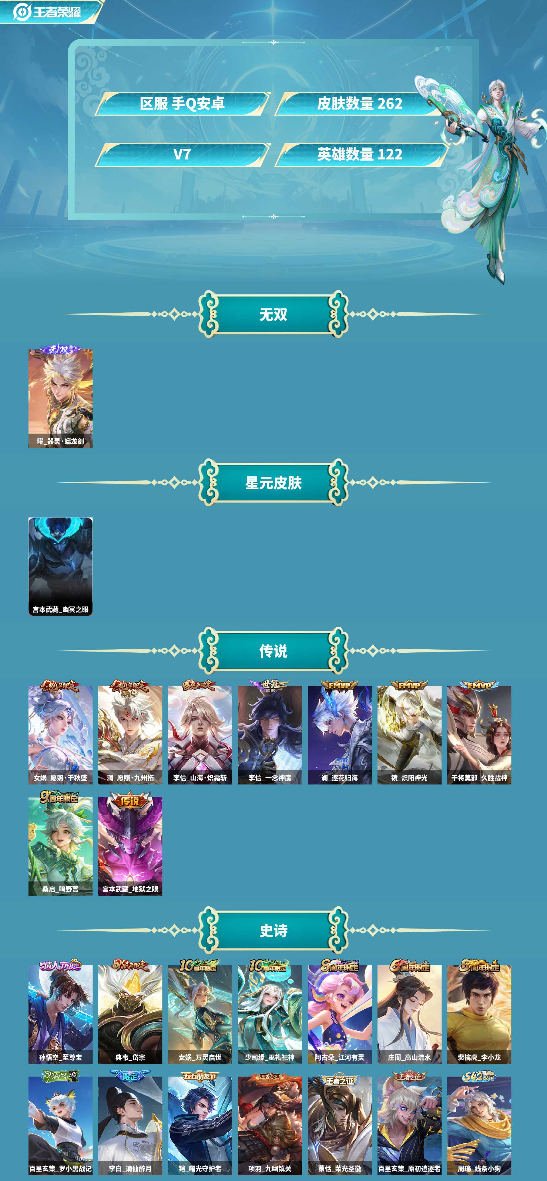 皮肤数量261印记总数9V7最强王者可修改账号类型2无双1星