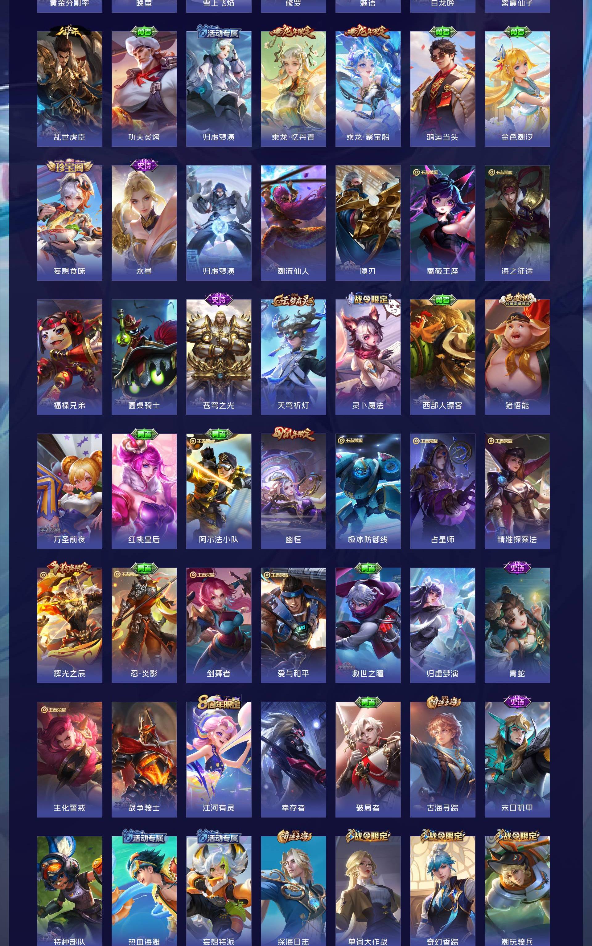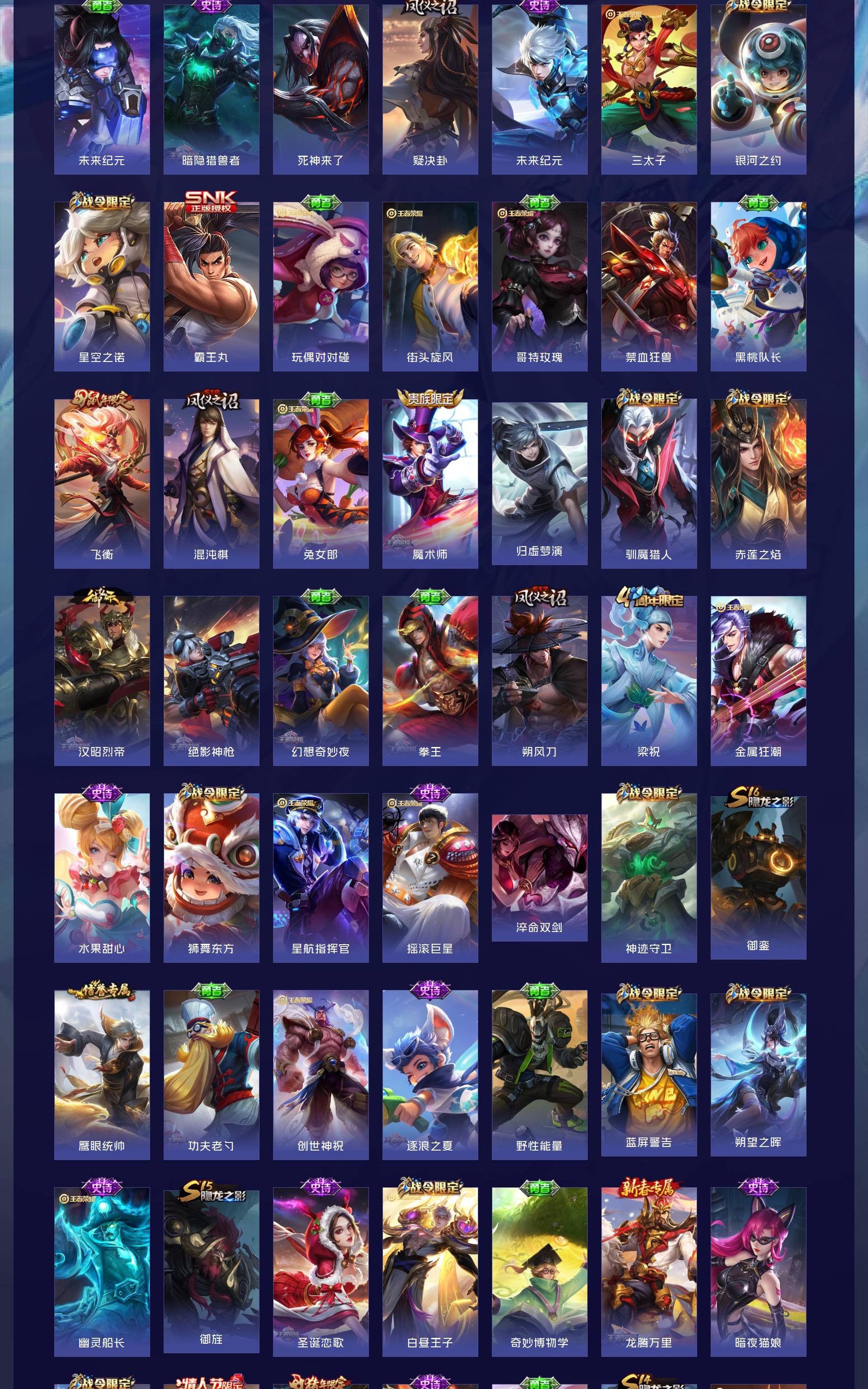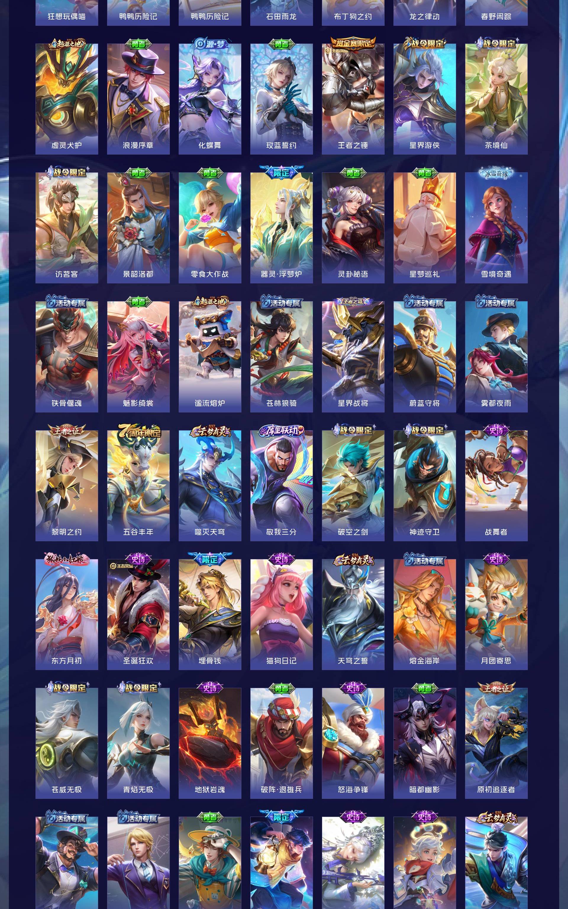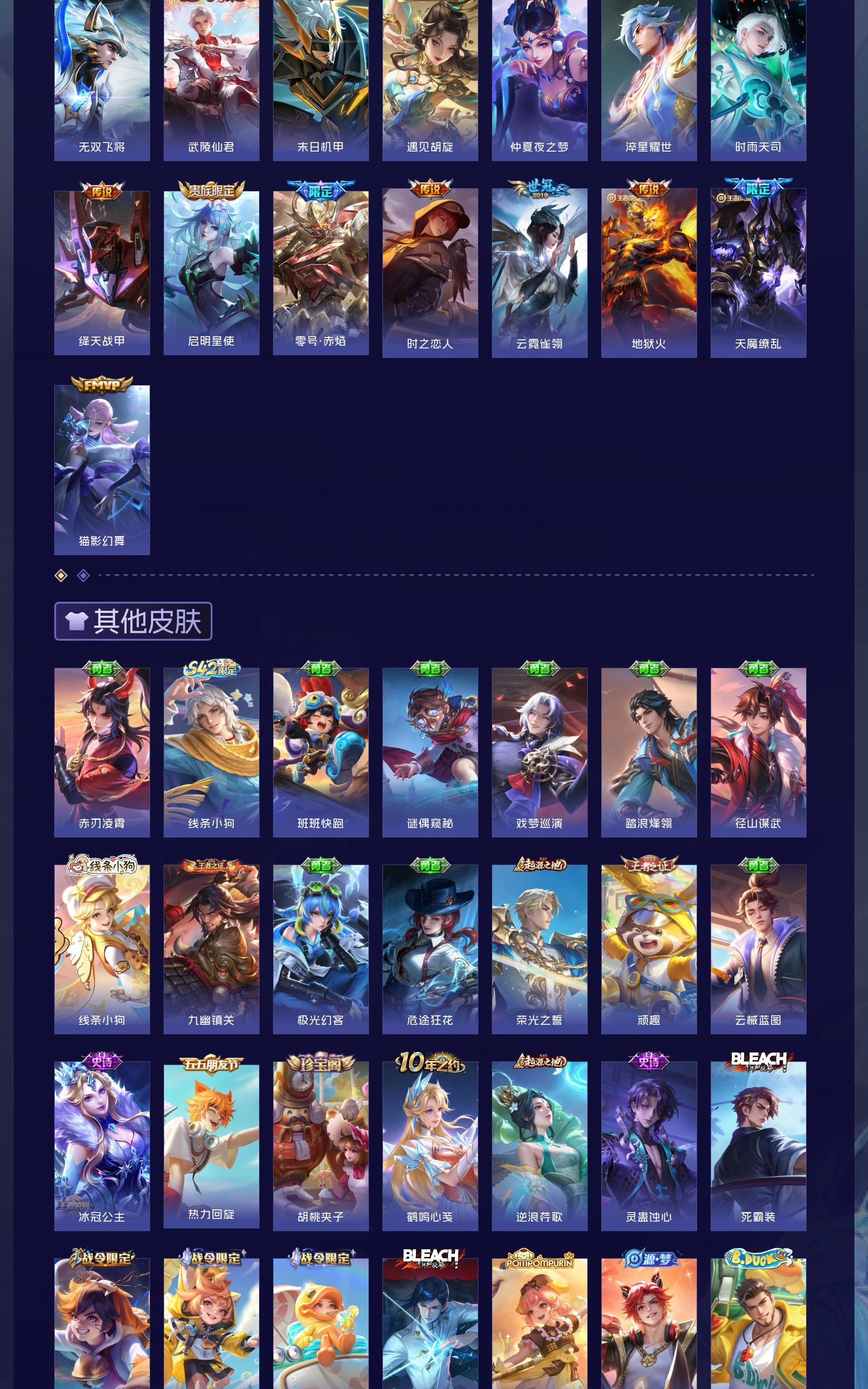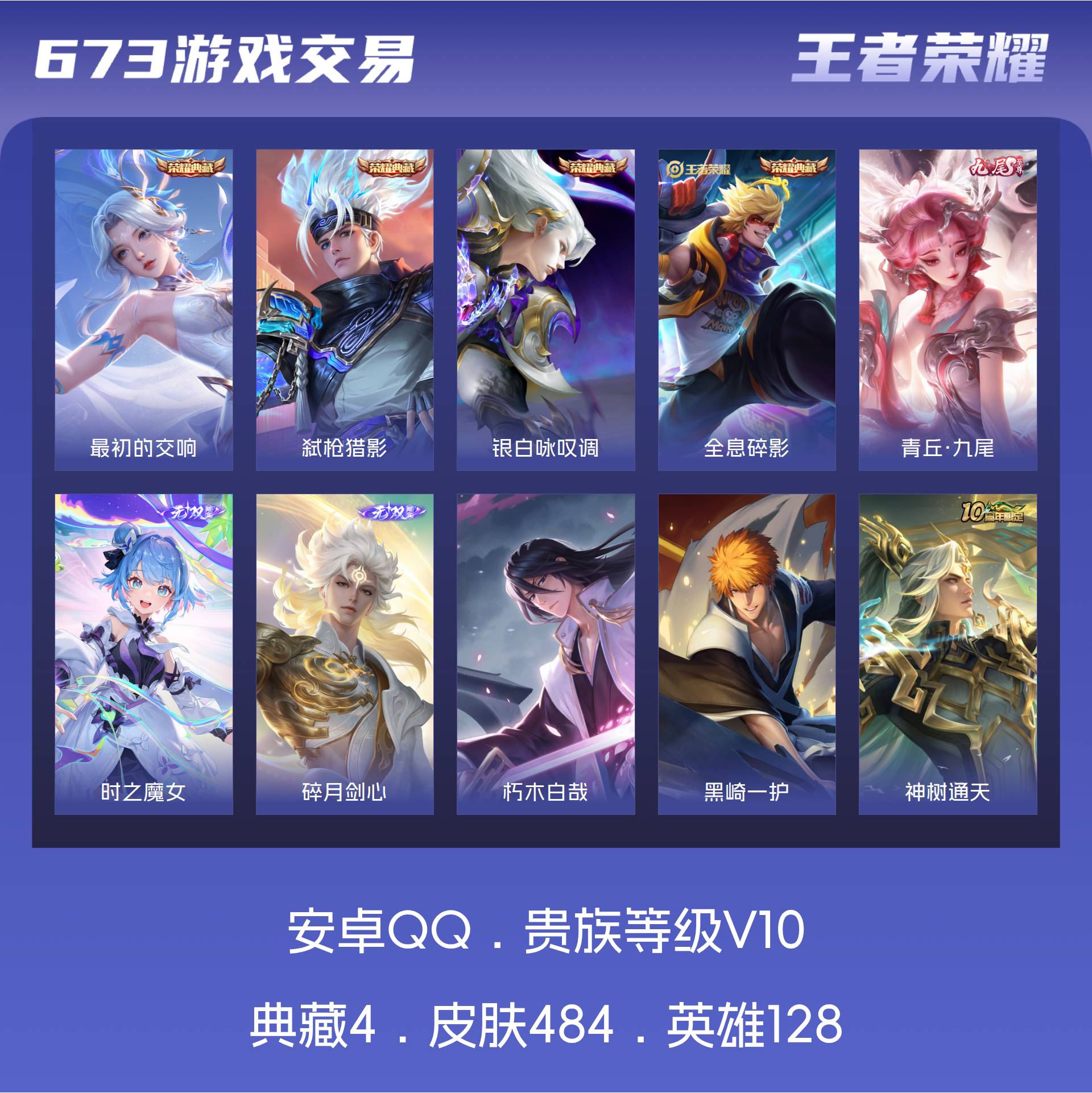 V10 皮肤484 英雄128 至尊星耀 荣耀典藏4 无双皮肤3 珍品传说2 星传说1 传说72 其他皮肤409