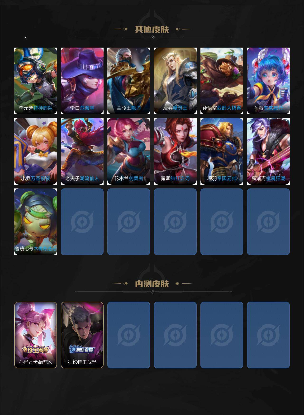 【限定皮肤】:蒙犽顽岩魄,虞姬夏日便利店,姜子牙天穹之誓,杨戬破阵退雄兵,狄仁杰阴阳师,赵云皇家上将,孙尚香蔷薇恋人,元歌无心,马可波罗暗影游猎,狄仁杰魔术师,项羽海滩派对,李元芳云中旅人,雅典娜黎明之约,鬼谷子五谷丰年,百里玄策原初追逐者,裴擒虎擒涛扼浪,云中君纤云弄巧,嫦娥
