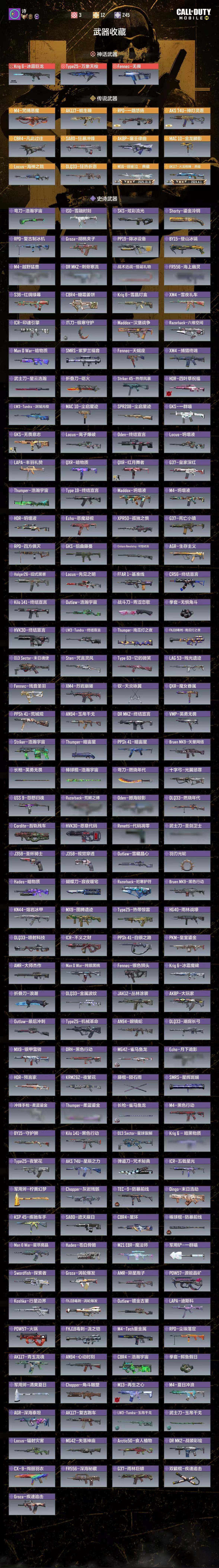 无二次 , 武器神话3 武器传说12 角色神话2 Krig6-冰霜巨龙,Type25-万象天梭,Fennec-无畏,AK117-蜕生瞳,RPD-一路悠扬 ,AKS74U-神灯灵愿,MAC 10-金龙鳞影,AK117-火龙咆哮·典藏,M16-翎雀泣·典藏,DLQ33-狂热祈愿,Locus-海神之戟,SA80-狂暴冲锋