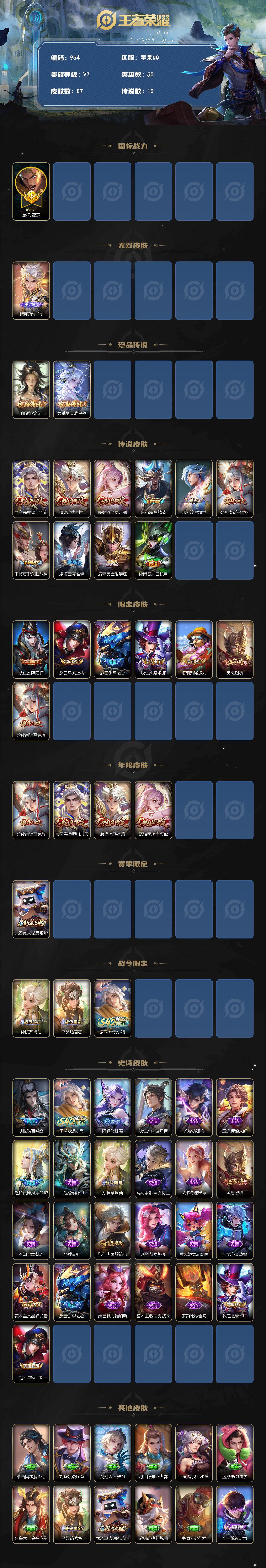 差6463升级v8,V7-50英雄-87皮肤-1无双-2珍品传说-10传说-2