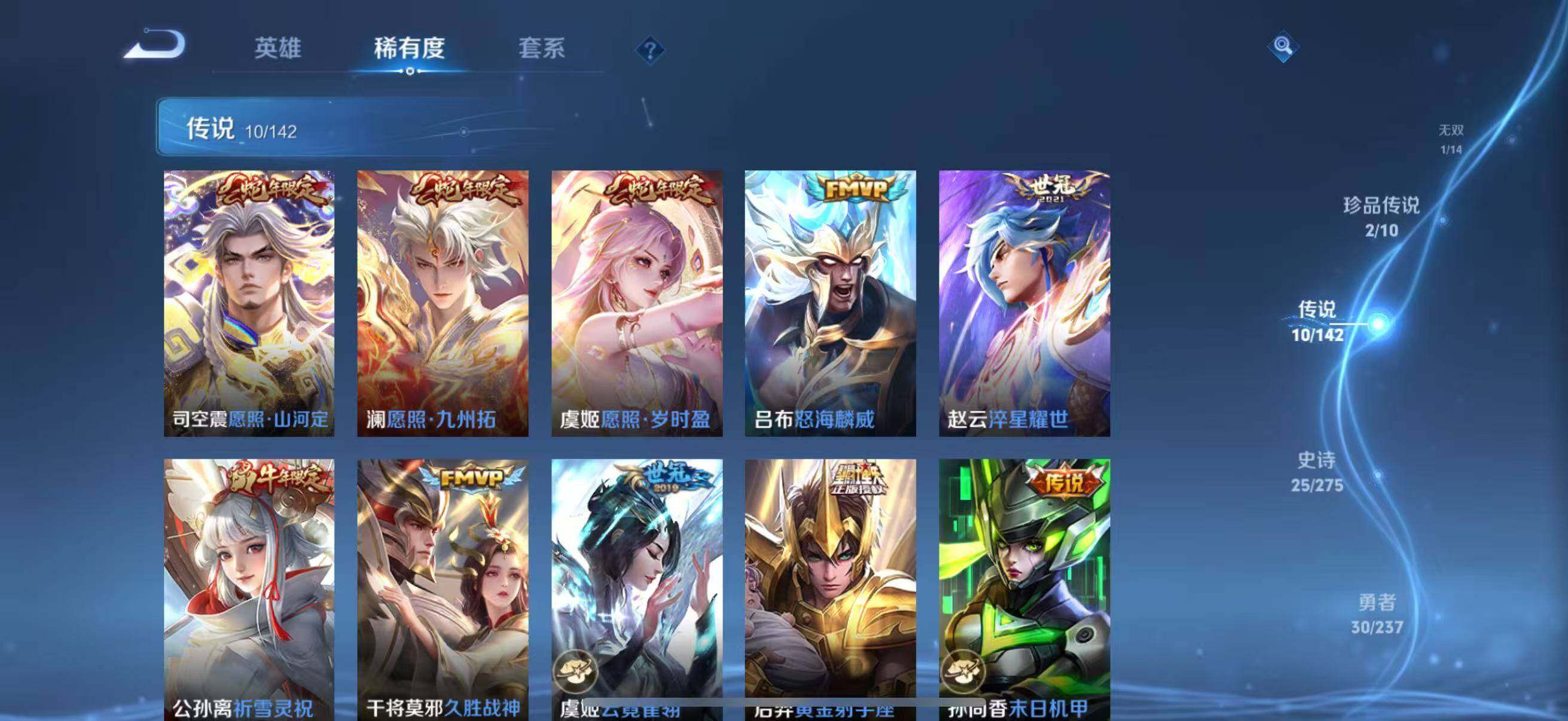 【传说皮肤】:司空震愿照山河定,澜愿照九州拓,虞姬愿照岁时盈,吕布怒海麟威,赵云淬星耀世,公孙离祈雪灵祝,干将莫邪久胜战神,虞姬云霓雀翎,后羿黄金射手座,孙尚