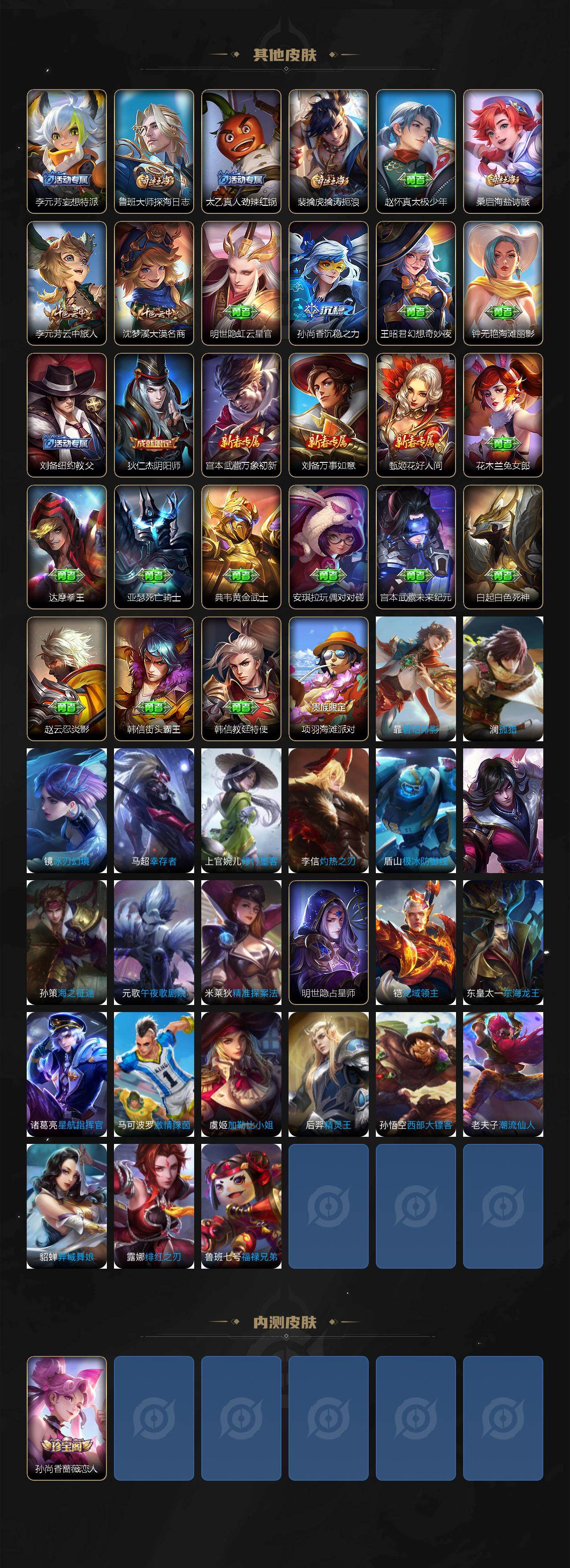 【限定皮肤】:姜子牙天穹之誓,狄仁杰阴阳师,赵云皇家上将,孙尚香蔷薇恋人,元歌无心,典韦岱宗,狄仁杰神器狴犴令,项羽海滩派对,李元芳云中旅人,鬼谷子五谷丰