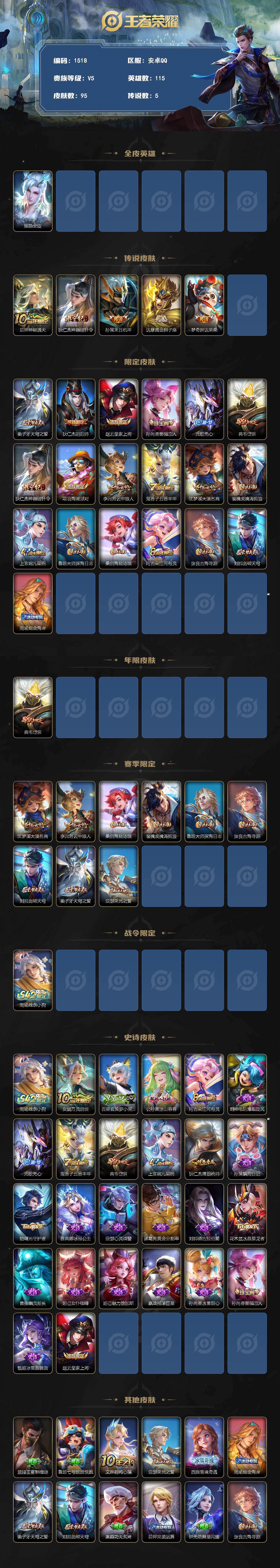 /2541145 王者荣耀账号 安卓Q-V5-最强王者段位-115英雄-95皮肤-5传说-25史诗