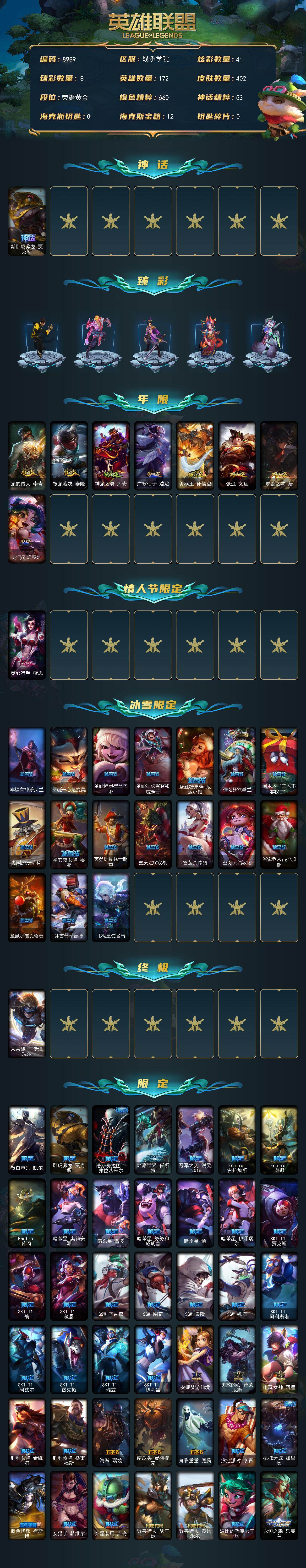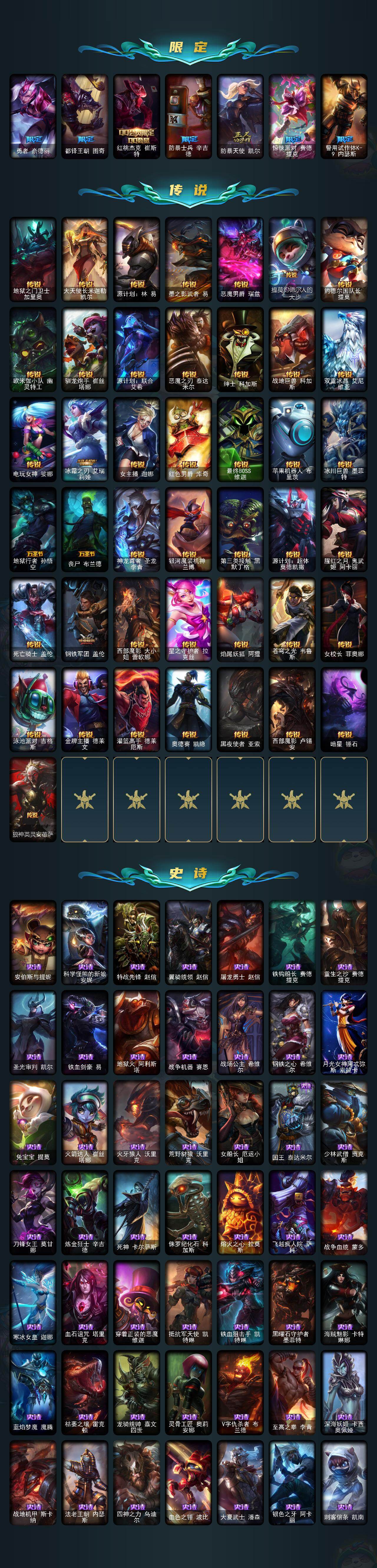 【龙瞎 黑龙黄龙炫彩】黄金段位-172英雄-402皮肤-41炫彩-1终极-1神话-76限定-43传说-91史诗
