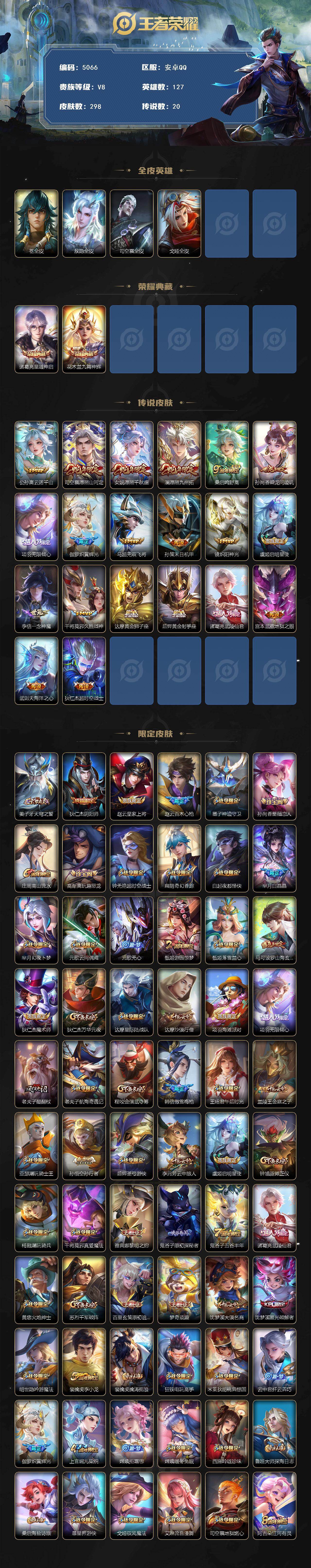 安卓Q-V8-最强王者段位-127英雄-298皮肤-2典藏皮肤-20传说-10