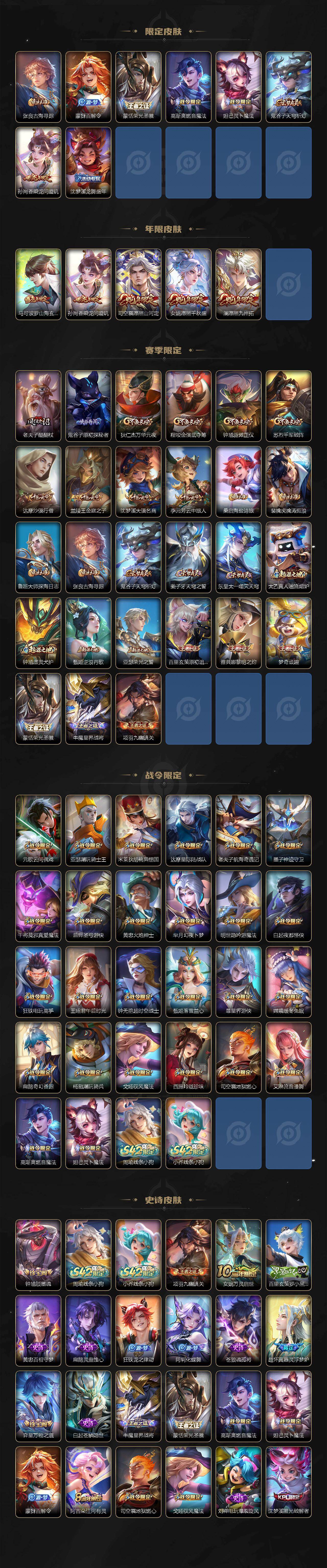 【传说皮肤】:公孙离云诺千山,司空震愿照山河定,女娲愿照千秋盛,澜愿照九州拓,桑启鸣野蒿,孙尚香乘龙问璇玑,项羽无限倾心,伽罗炽翼辉光,马超无双飞将,孙策末日机甲,镜炽阳神光,虞姬