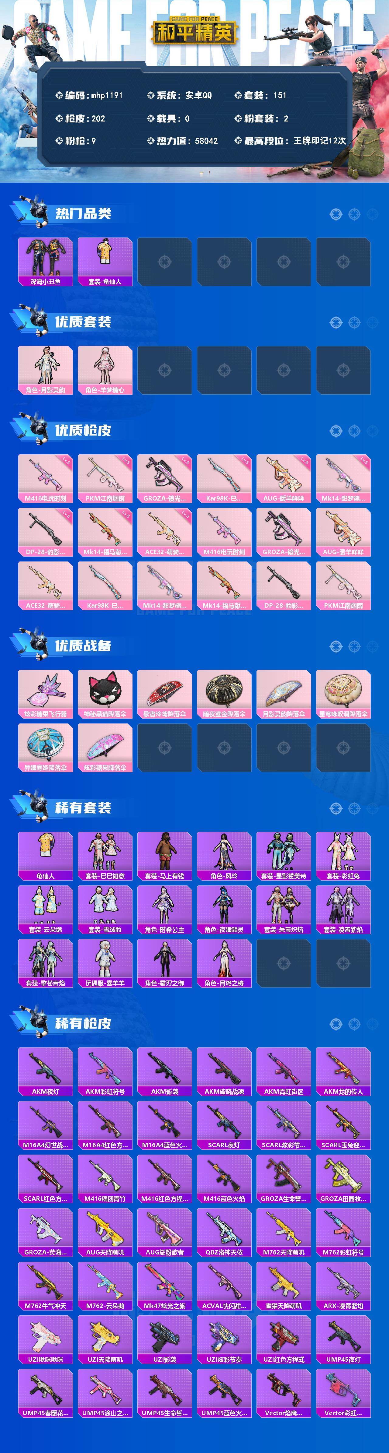 【mhp1191】安卓 手Q-2粉装-9特效枪-0载具-1粉色飞行器-58042热力值-12王牌印记-151套装-202枪皮