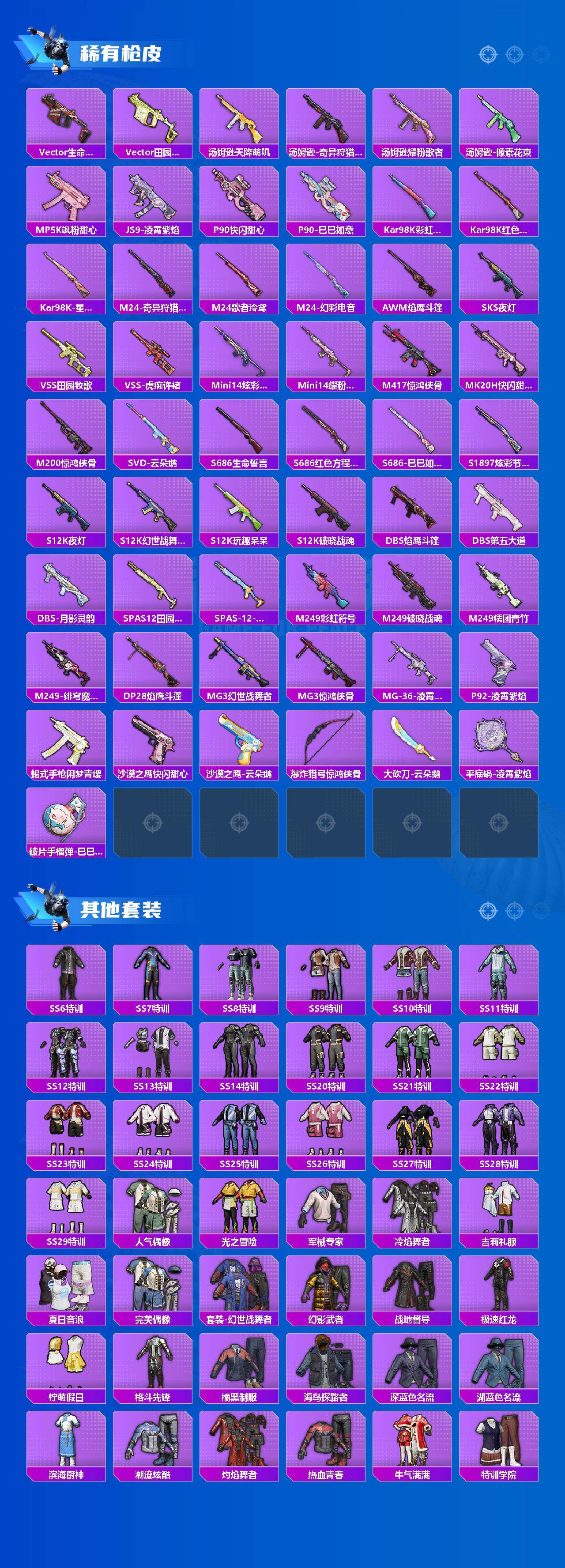 【粉色枪皮等级】:M416-电玩时刻(五级),GROZA-镜光银凌(五级),AUG-暖羊咩咩(五级),ACE32-萌骑漫游(三级),Kar98K-巳巳如意(五级),Mk14-甜梦熊