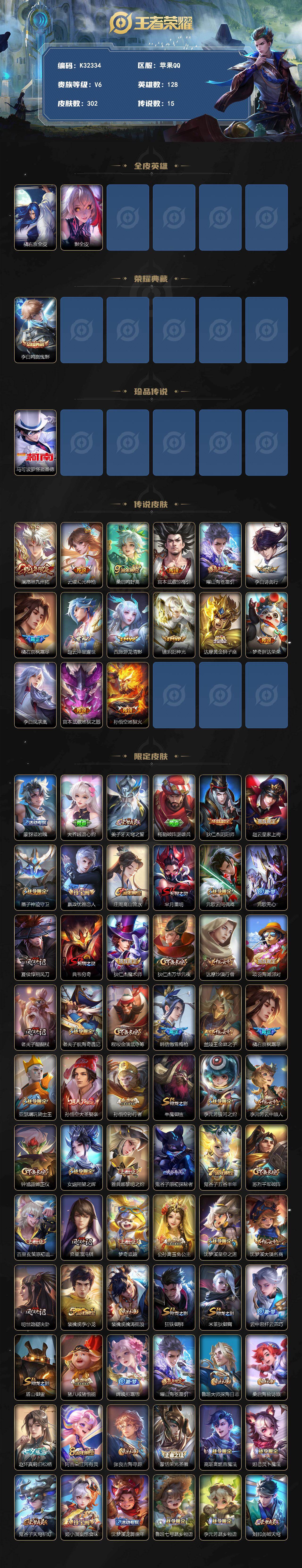 苹果Q-V6-最强王者段位-128英雄-302皮肤-1典藏皮肤-1珍品传说-15传说-73史诗