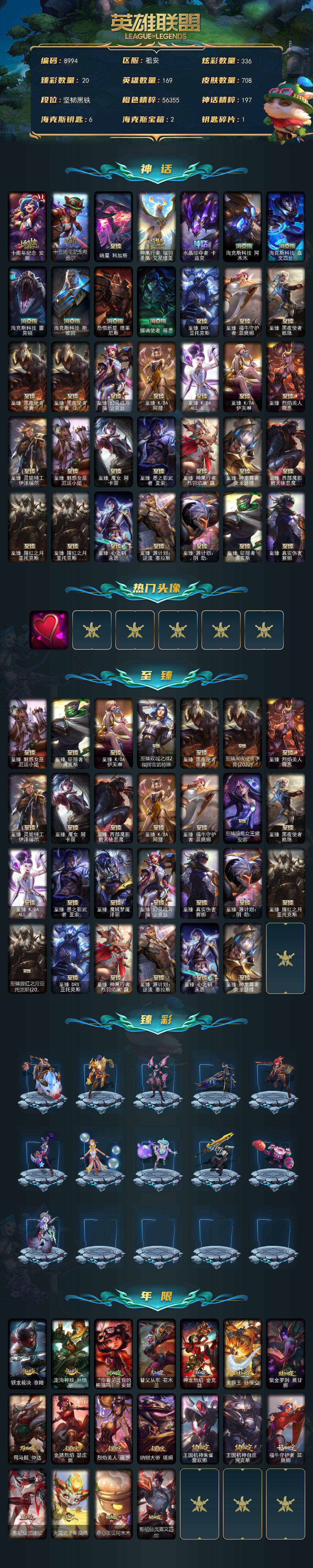 未定级段位-169英雄-708皮肤-336炫彩-5终极-38神话-120限定-75传说-125史诗