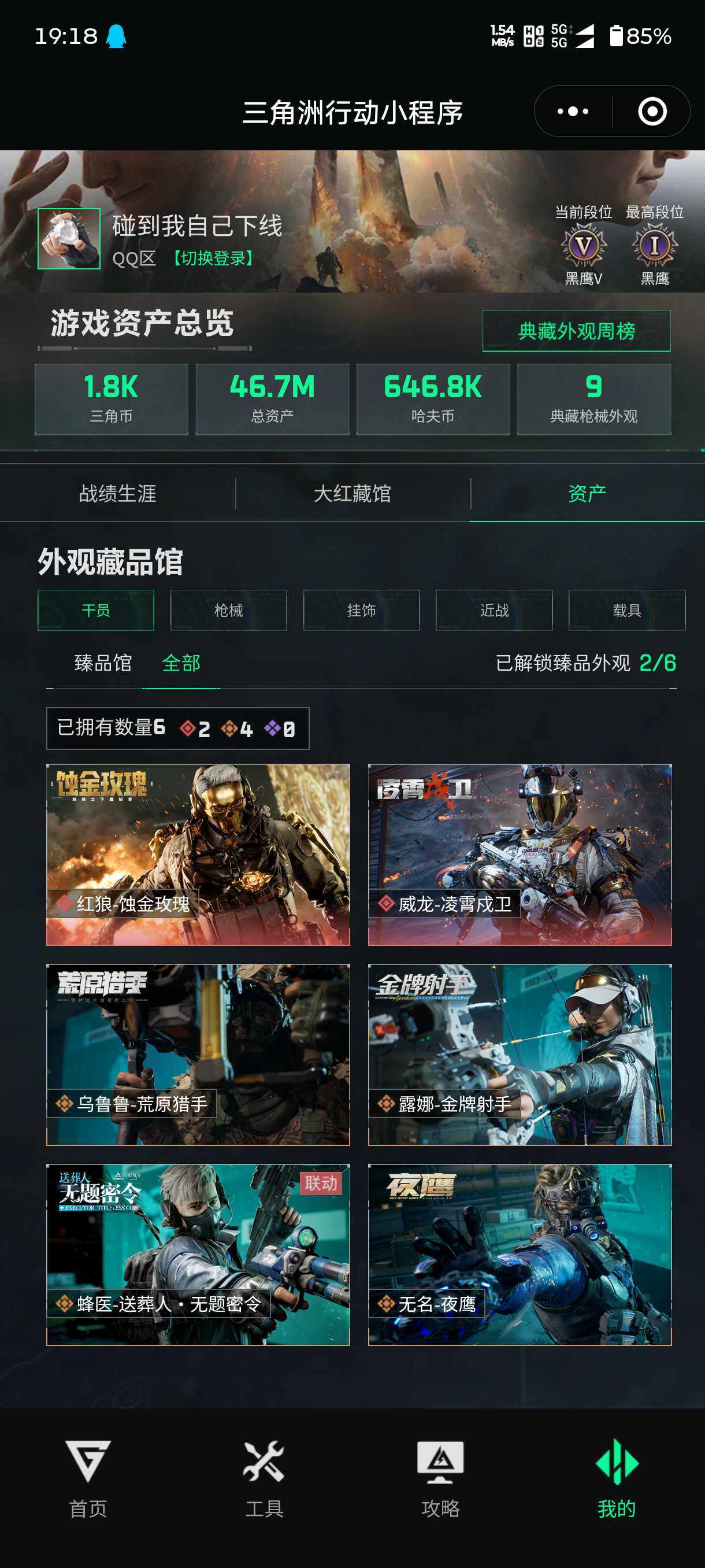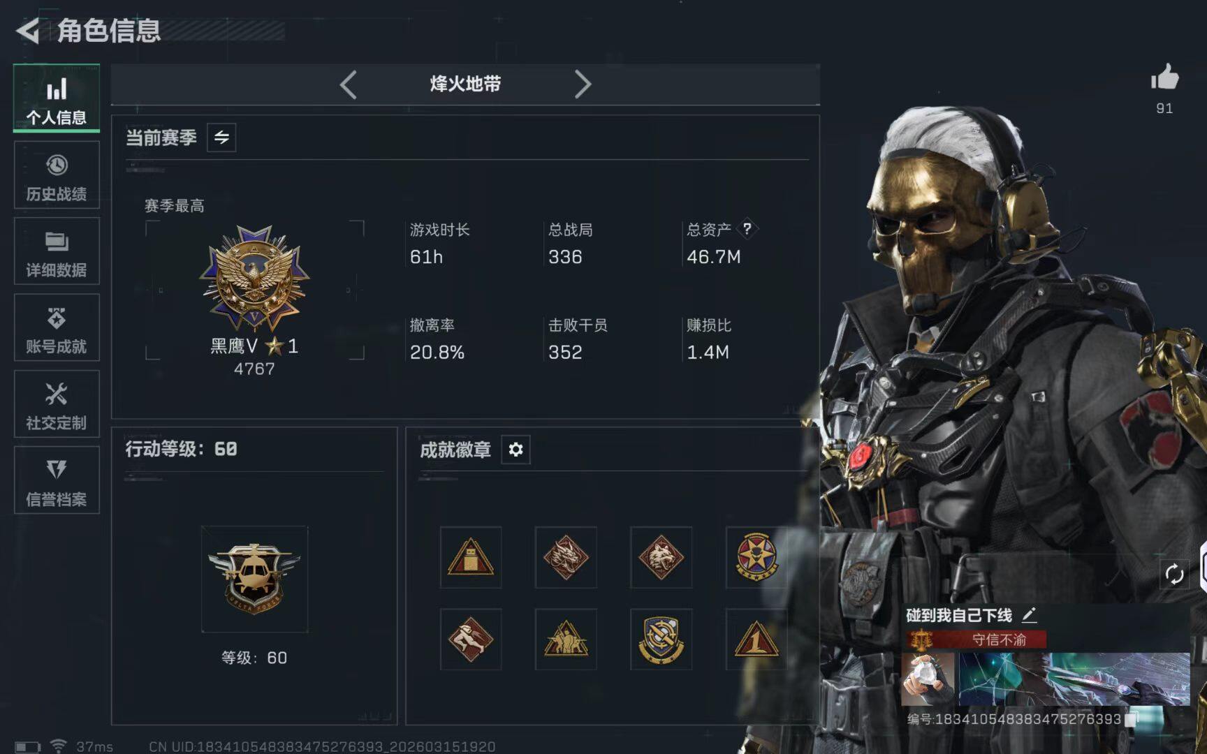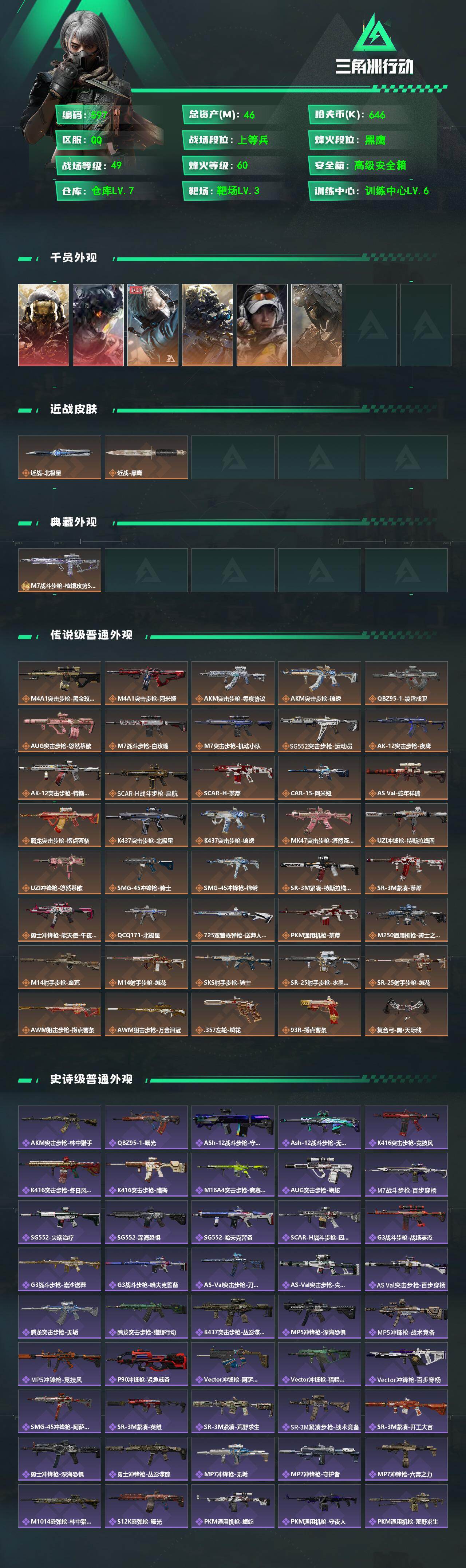 46m总资产-646k哈伏币-60烽火等级-黑鹰-49战场等级-上等兵