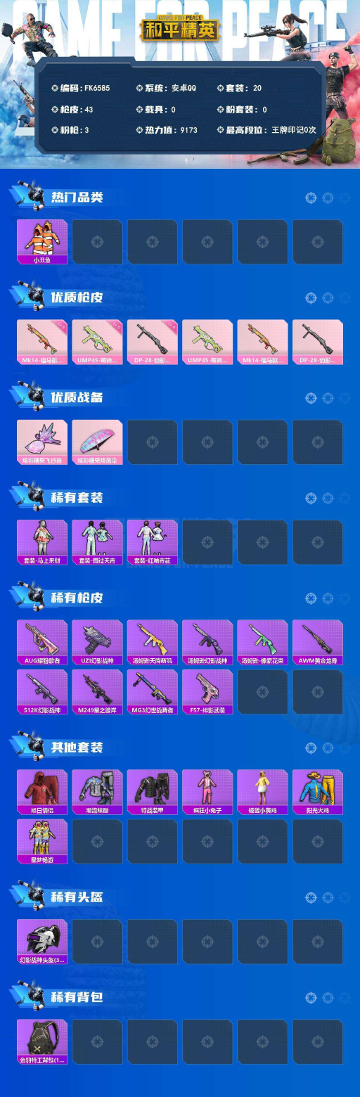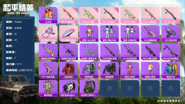 素材号-地铁49点满天赋-小丑鱼-3特效枪-五级UMP45-萌骑冒险-幻影战神头盔】安卓 手Q-0粉装-3特效枪-0载具-1粉色飞行器-9173热力值-1王牌印记-20套装-43枪皮 【热门品类】:套装-小丑鱼 【粉色枪皮等级】:UMP45-萌骑冒险(五级),Mk14-福马献瑞(五级),DP-28-豹影疾电(四级) 【粉色枪皮】:UMP45-萌骑冒险,Mk14-福马献瑞,DP-