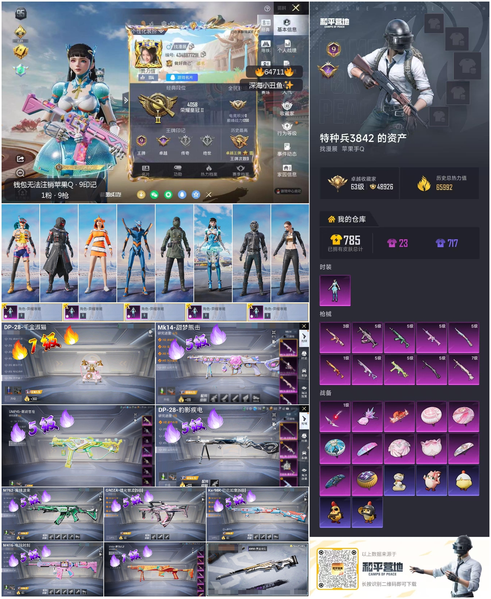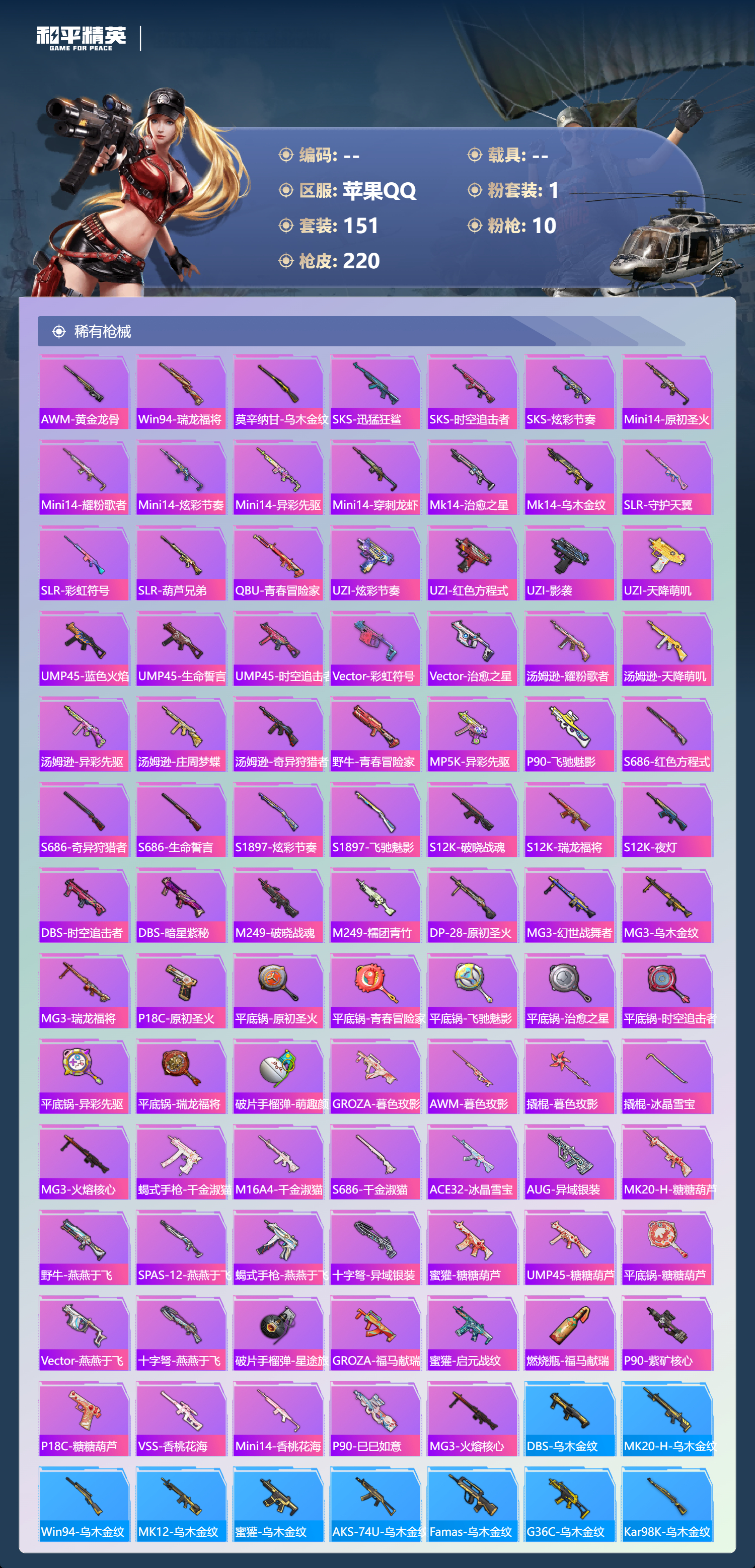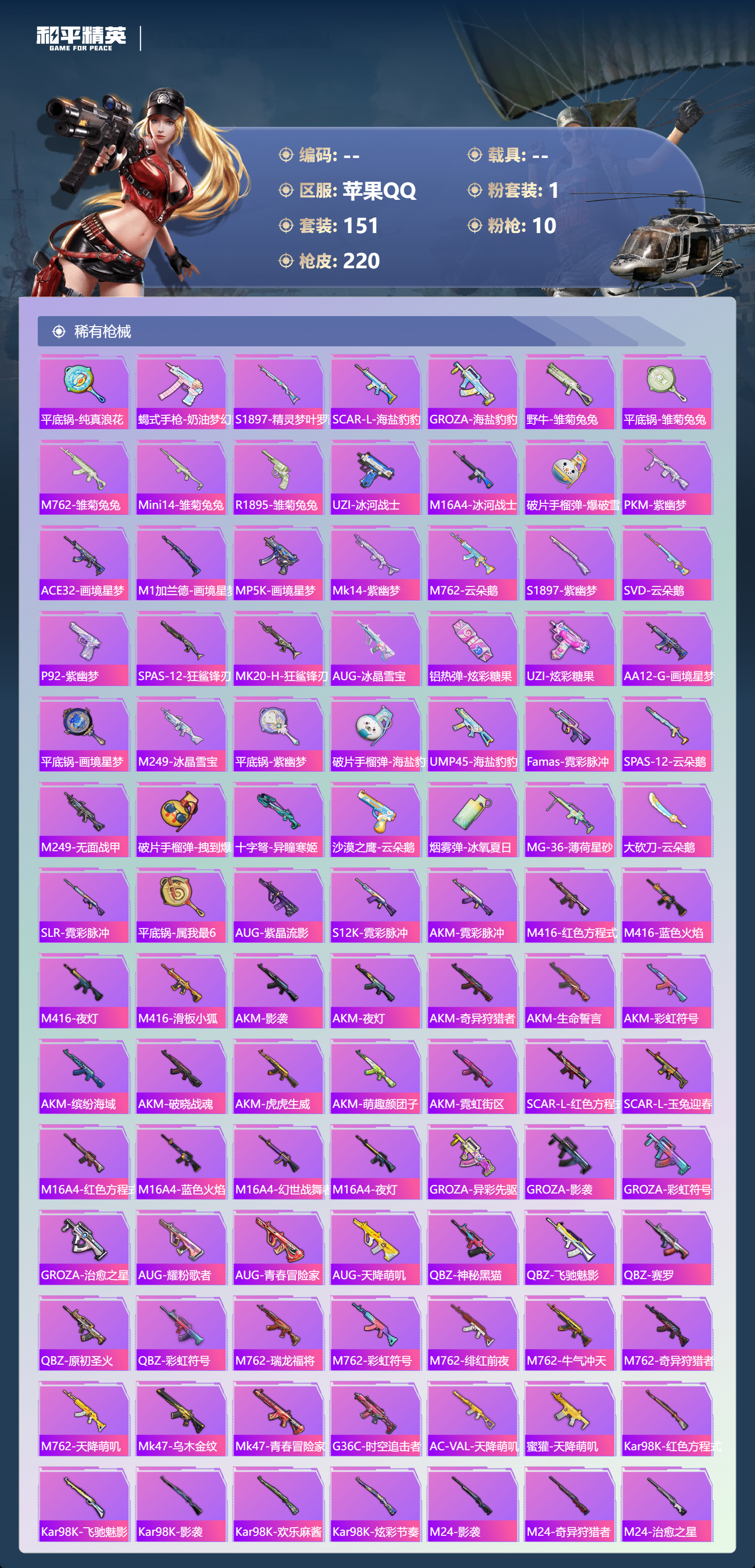 hs64711 苹果手Q-9王牌印记-1粉装-10特效枪-66040热力值-151套装-220枪皮-2卓越印记