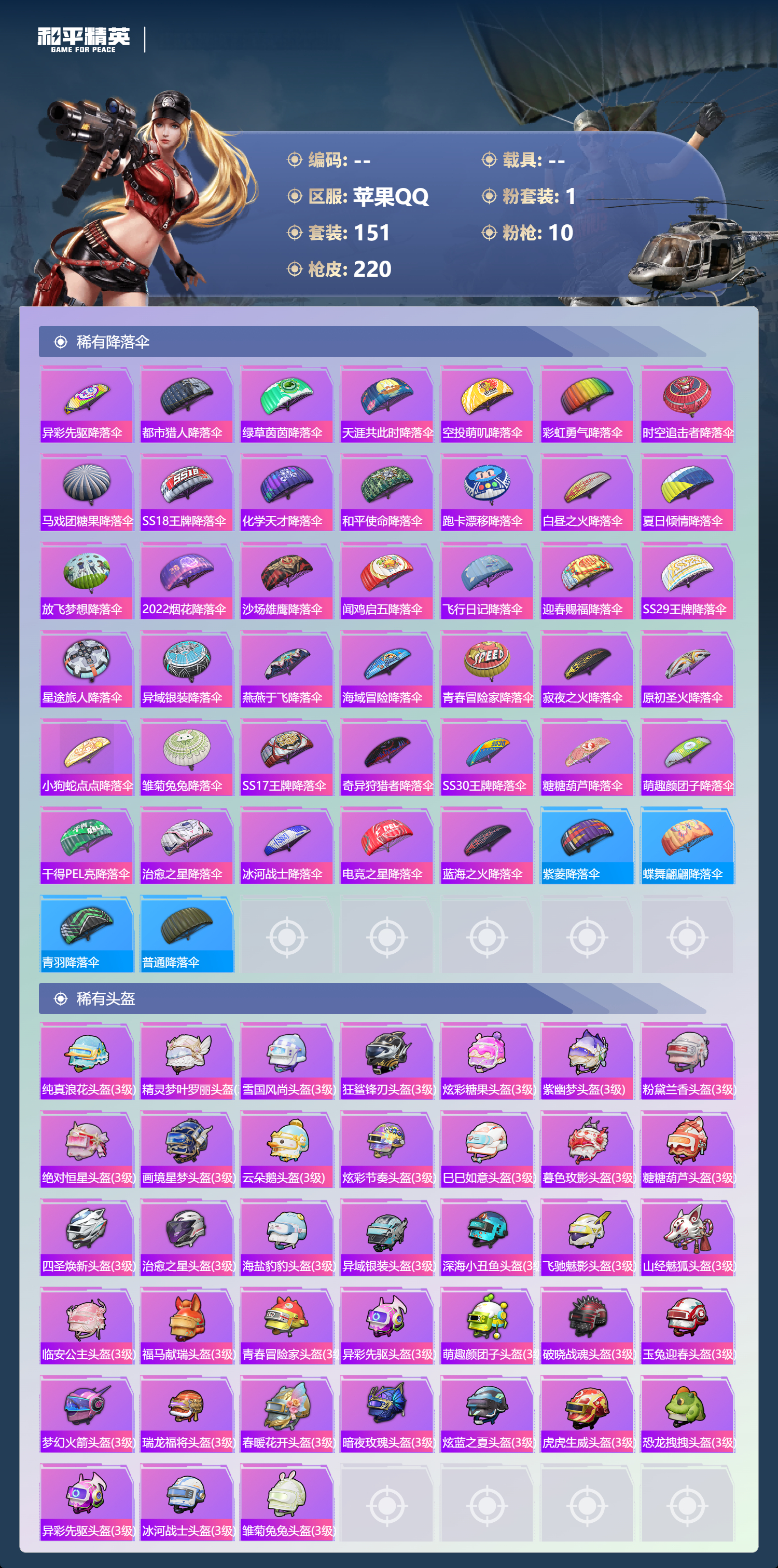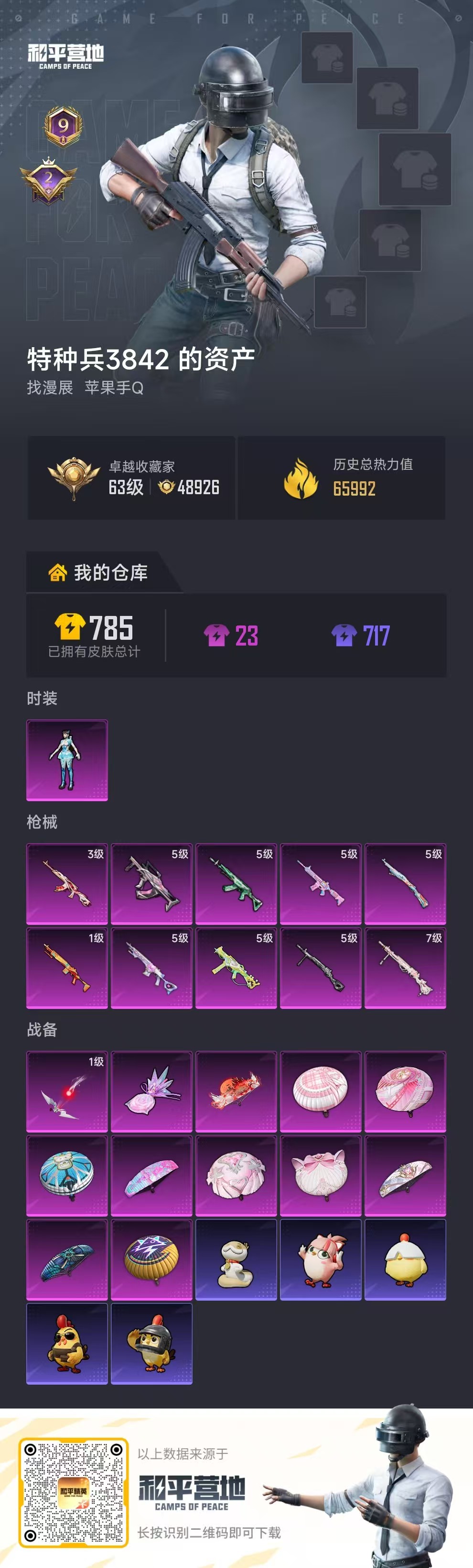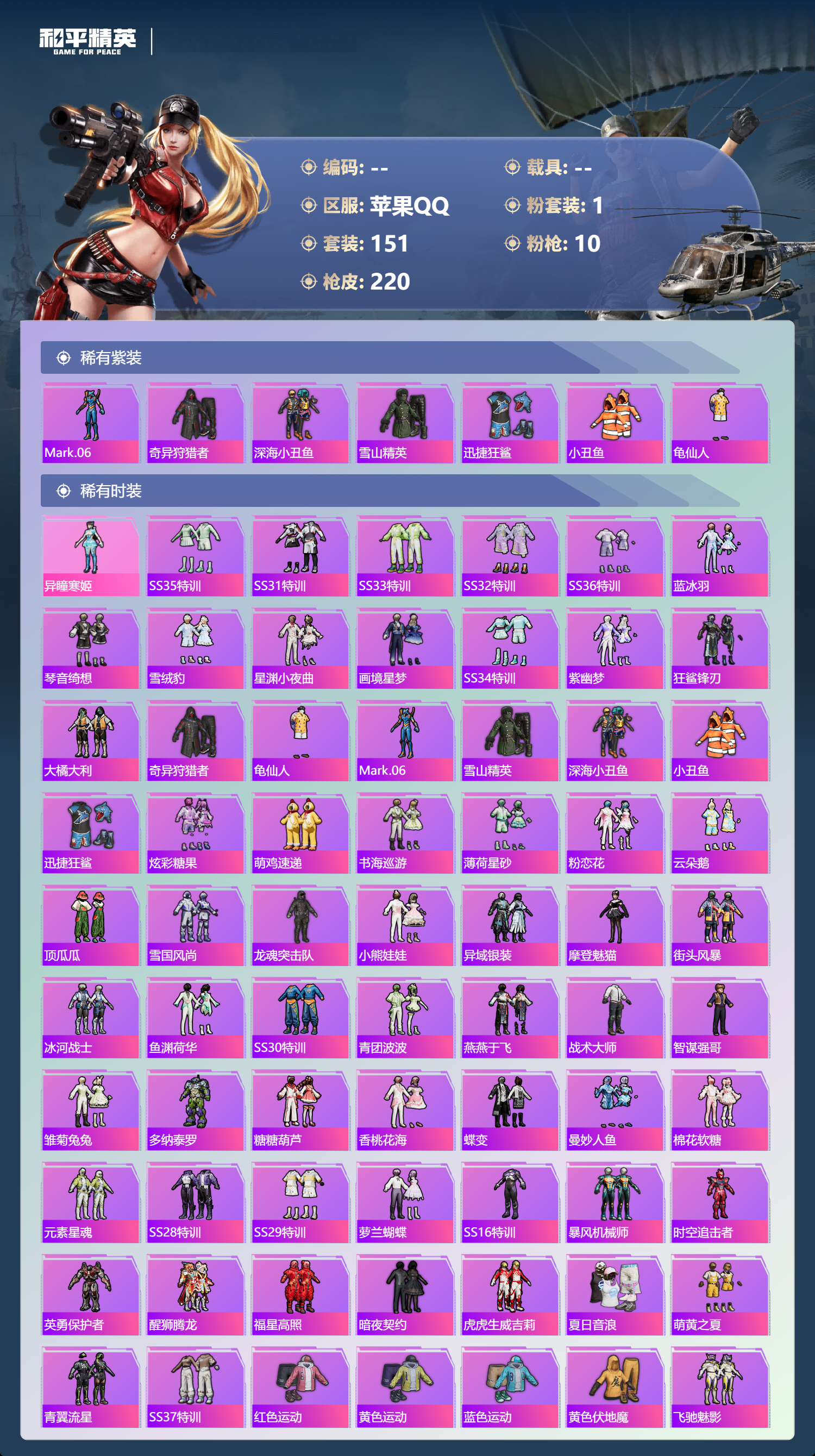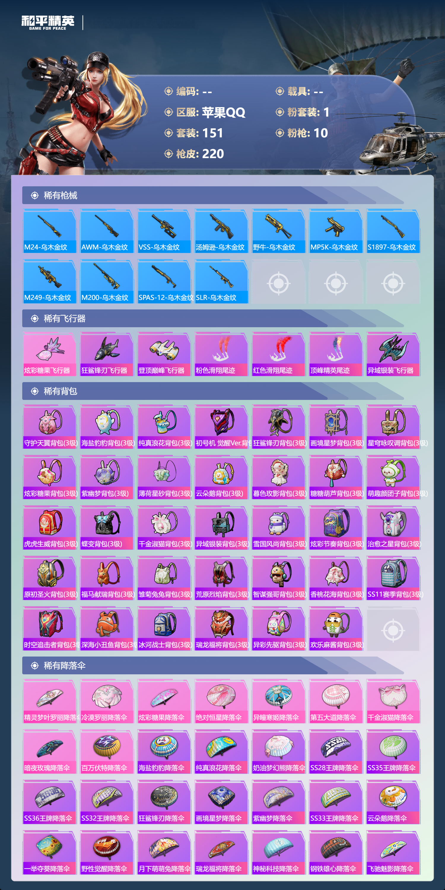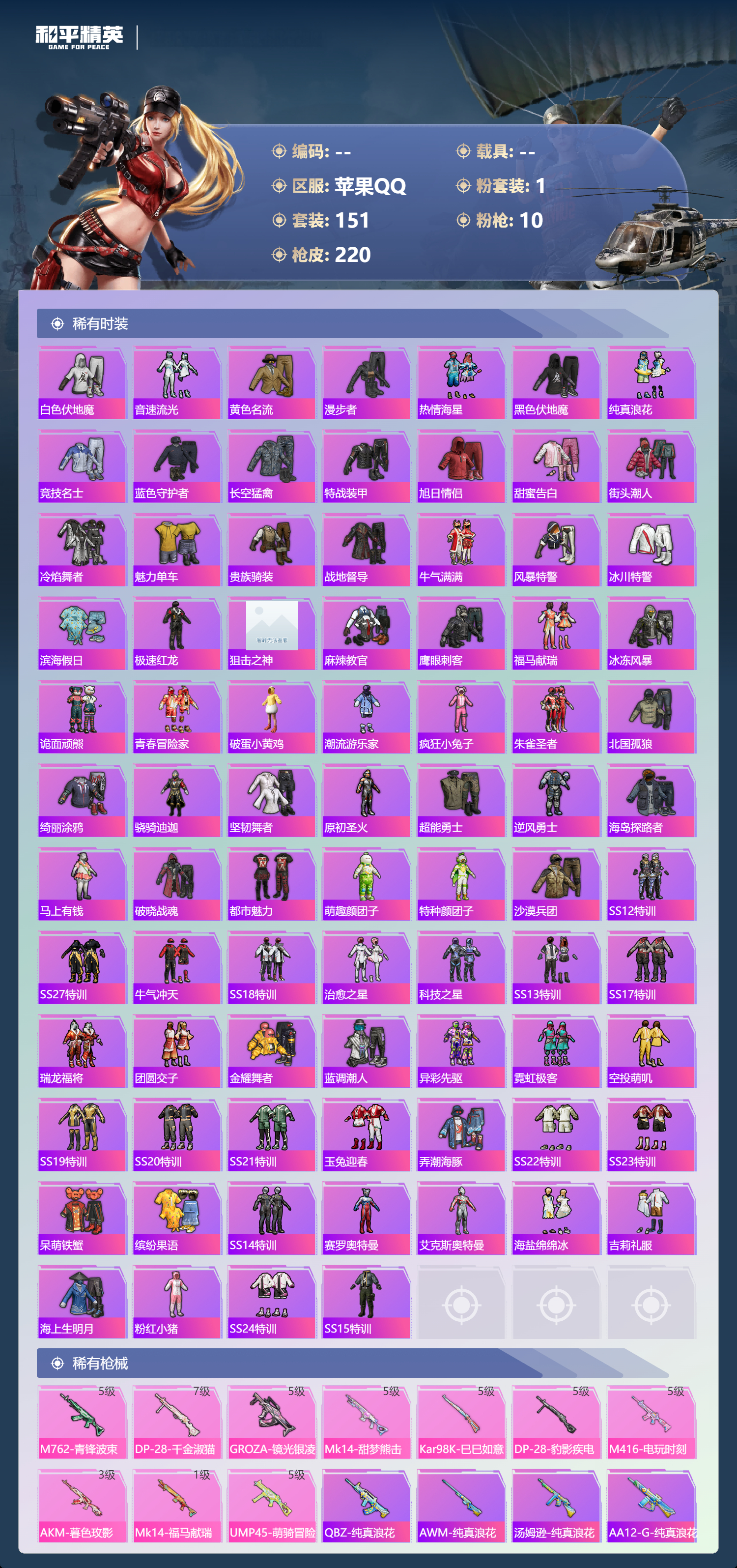 9王牌印记-1粉装-10特效枪-66040热力值-151套装-220枪皮-2卓越印记