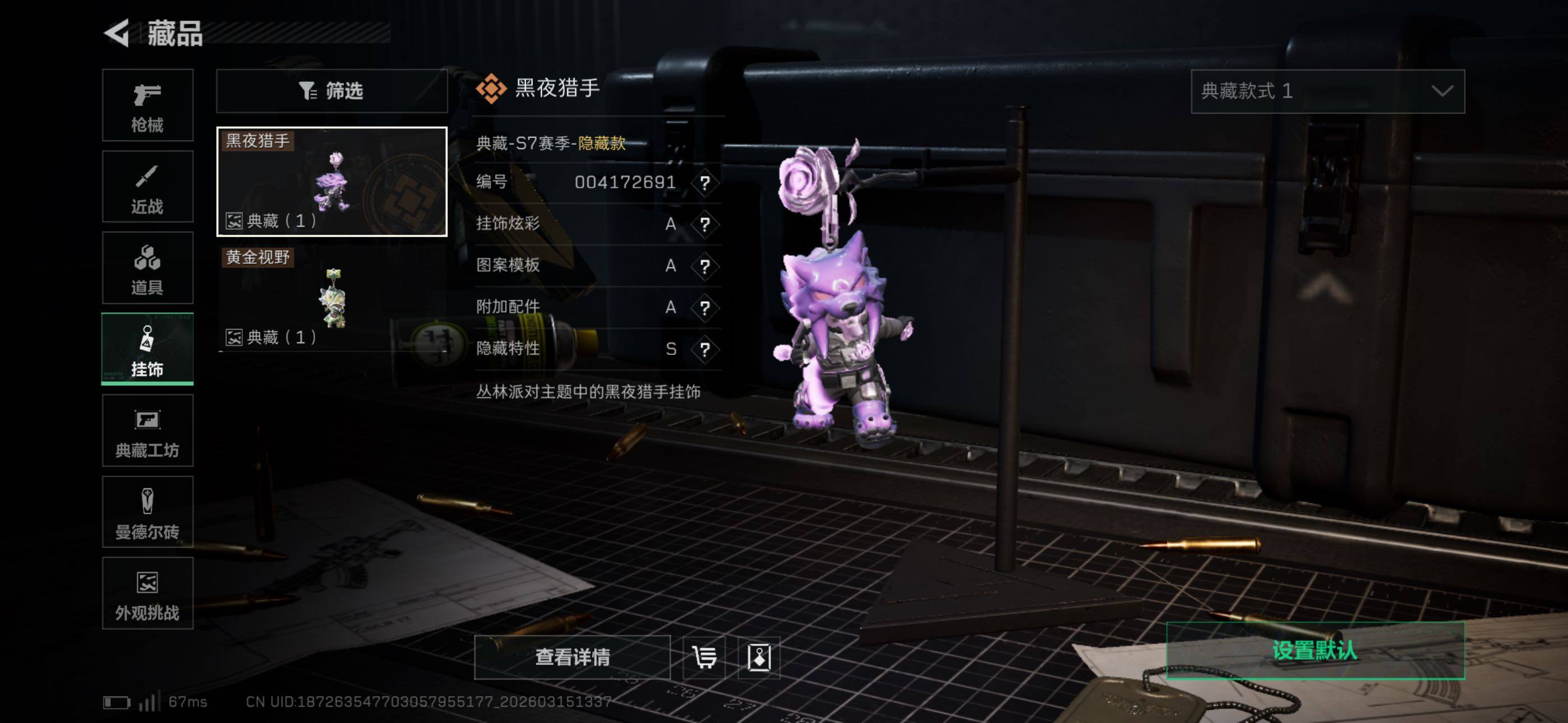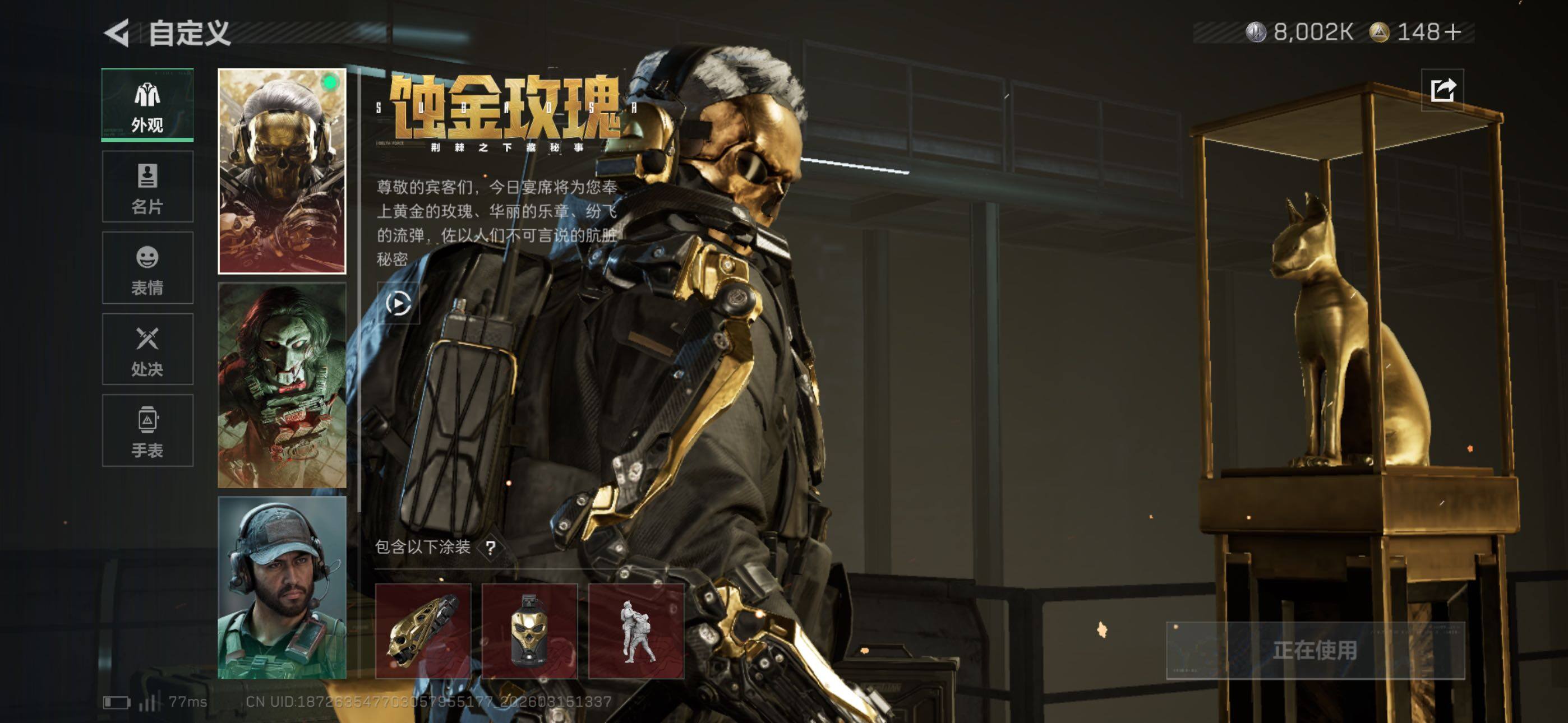 {特价出售}等级:60总资产:179.4M 纯币8002K 隐藏挂饰:1S黑夜猎手 红皮:红狼-蚀金玫瑰 刀皮:近战-龙牙/近战-电锯惊魂/ 砖皮: 腾龙突击步枪-气象感应(优品C冰) 特勤处:仓库9,训练6,靶场5 部门22322 无名-夜鹰,深蓝-不破誓约,红狼-电锯惊魂,露娜-金牌射手