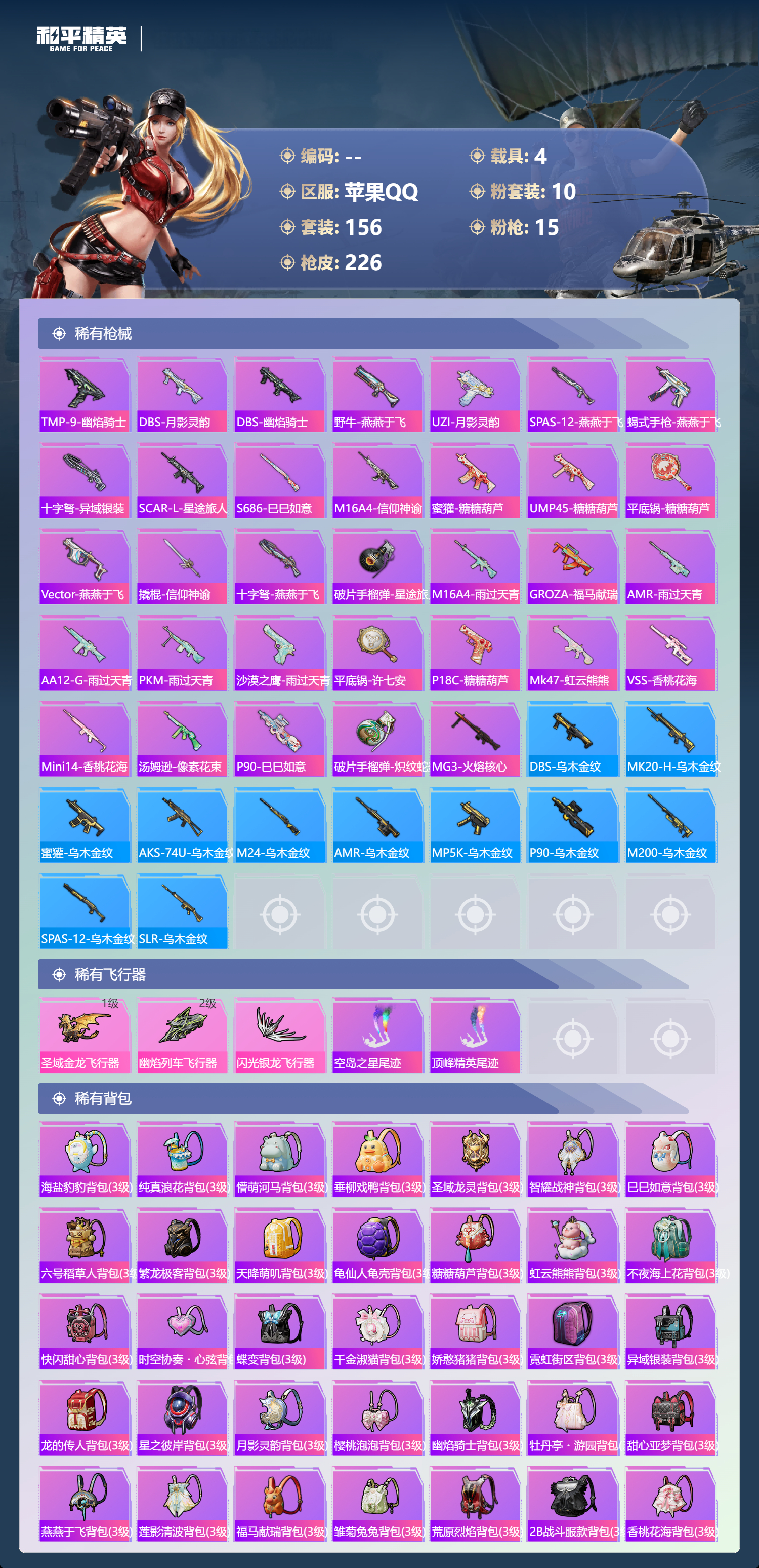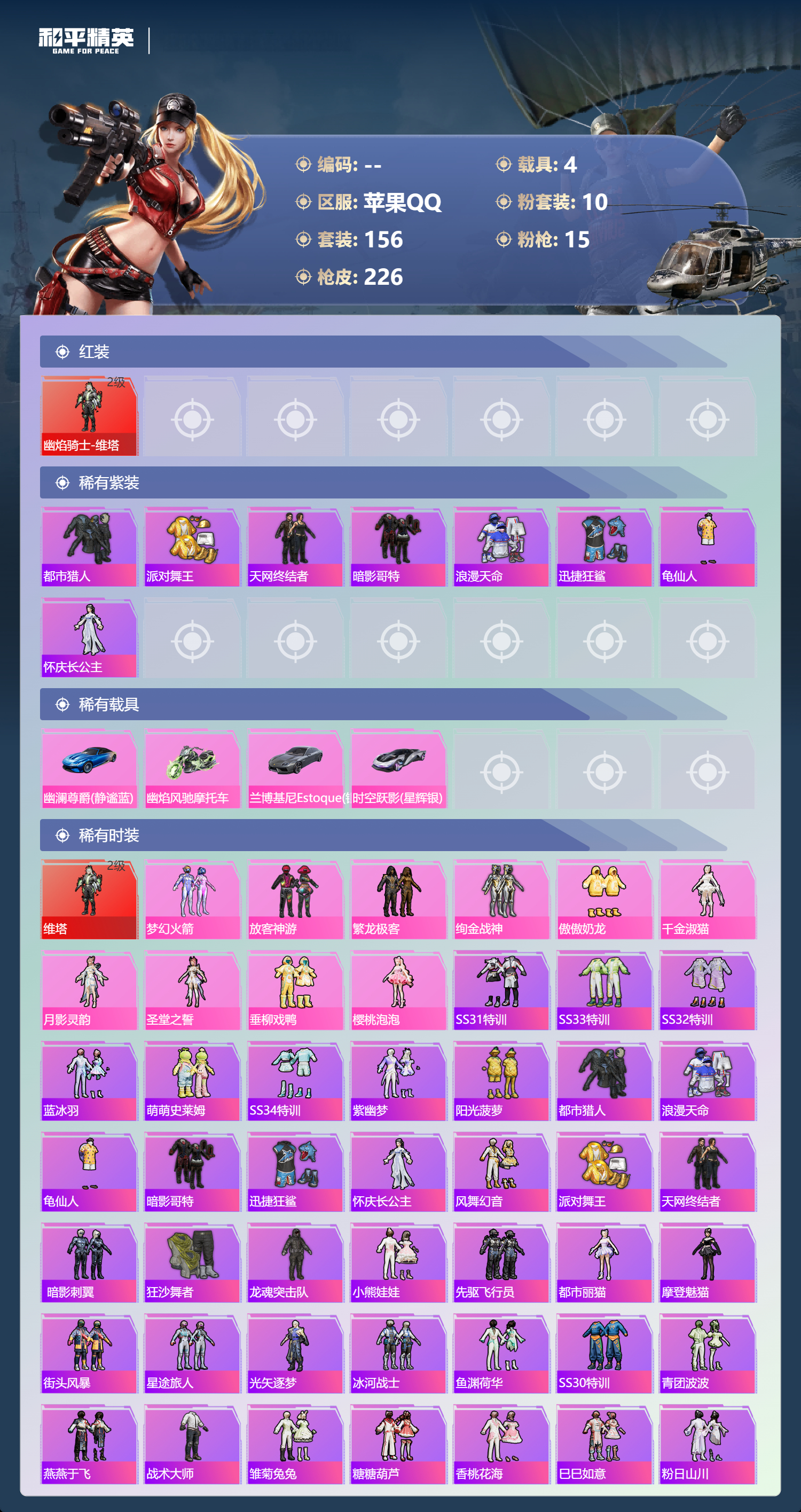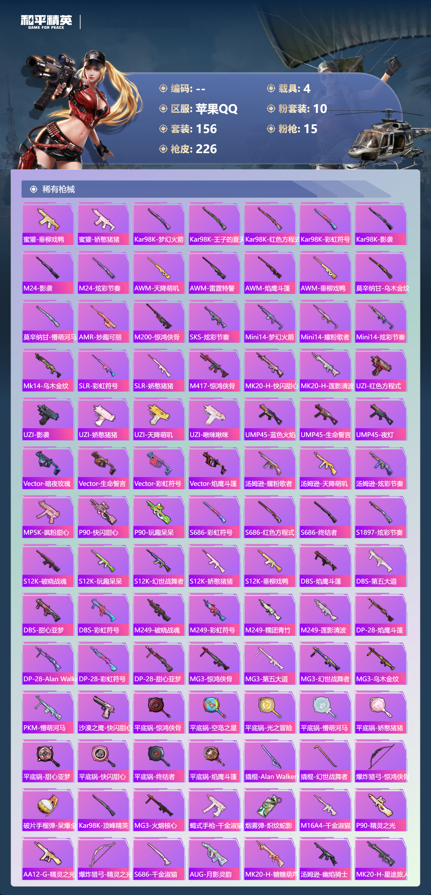 hs64714 苹果手Q-13王牌印记-1红装-10粉装-15特效枪-4载具-74123热力值-156套装-226枪皮