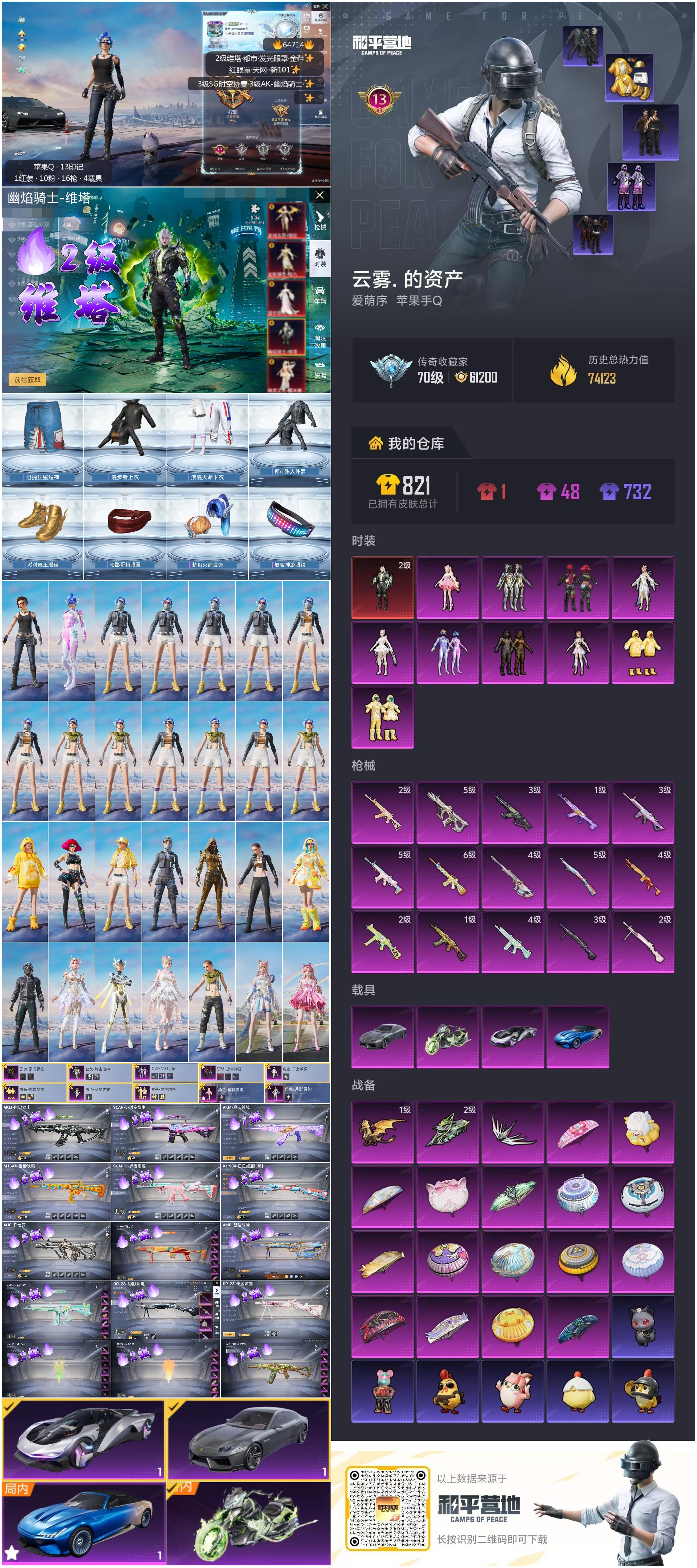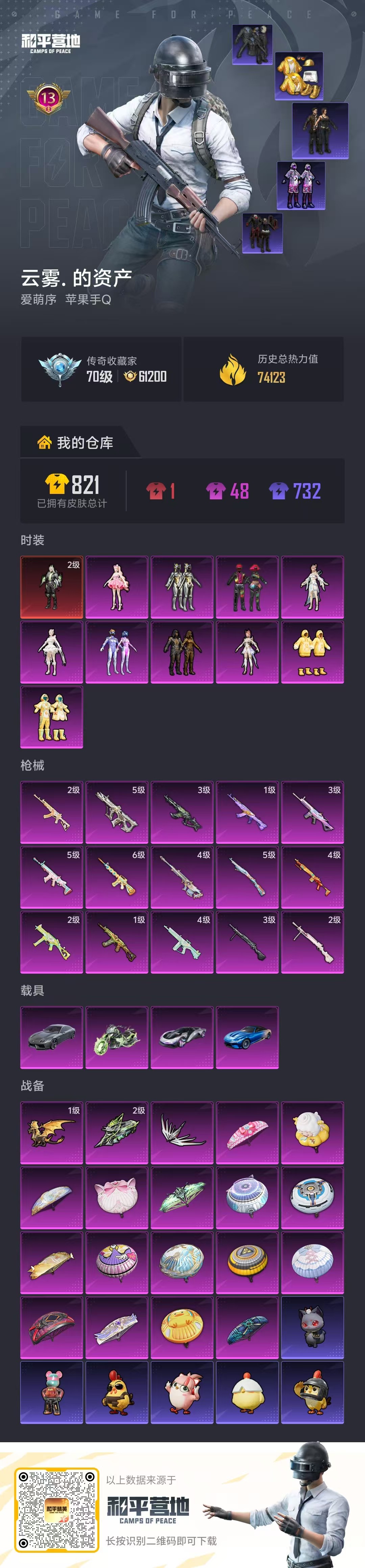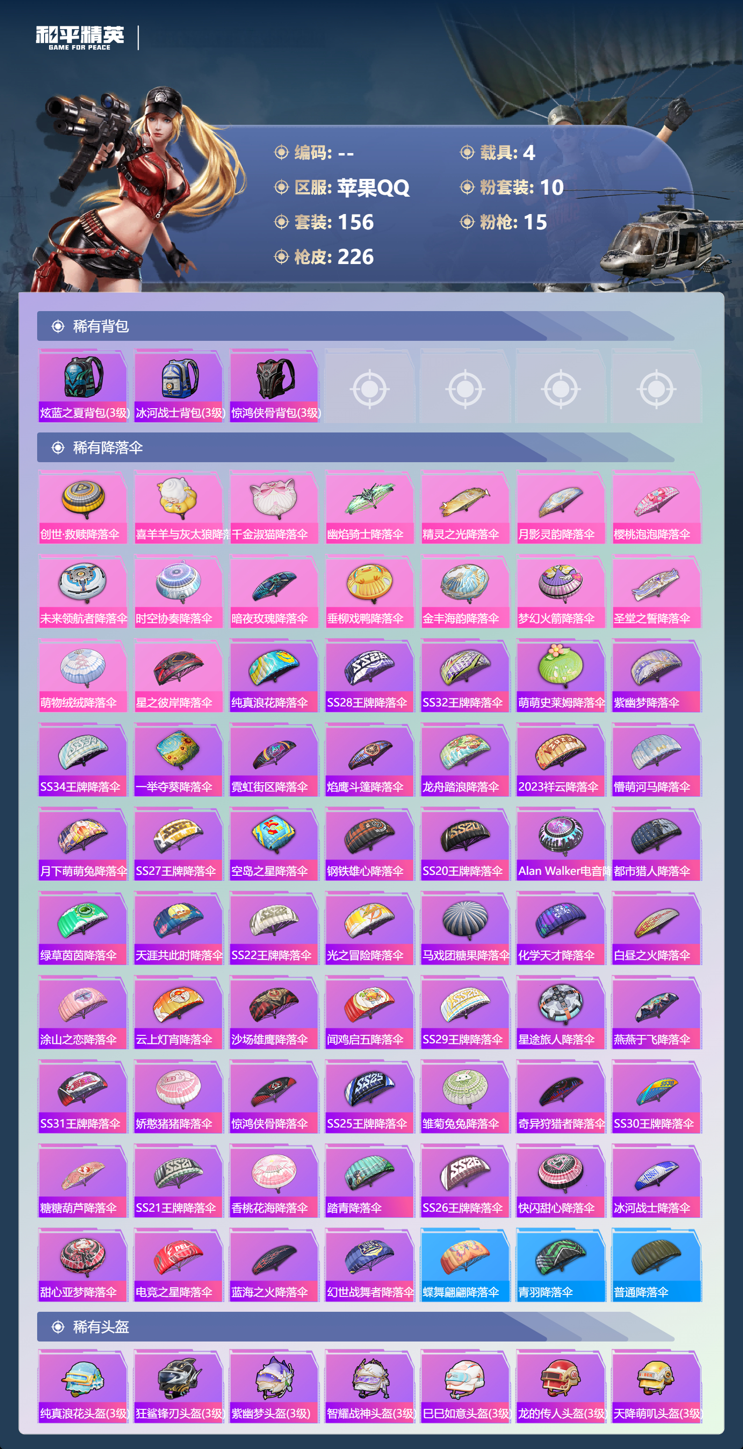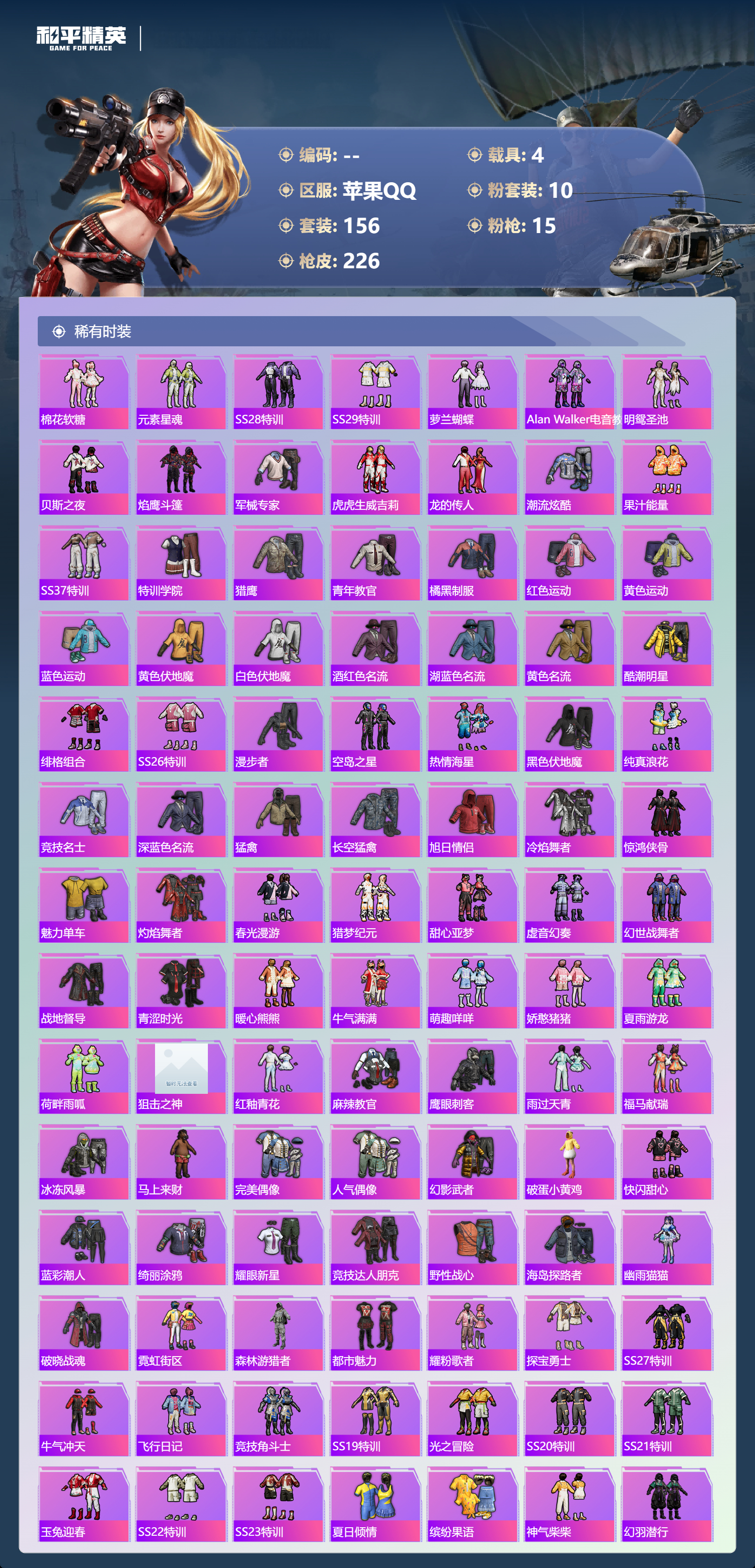 hs64714 苹果手Q-13王牌印记-1红装-10粉装-15特效枪-4载具-74123热力值-156套装-226枪皮