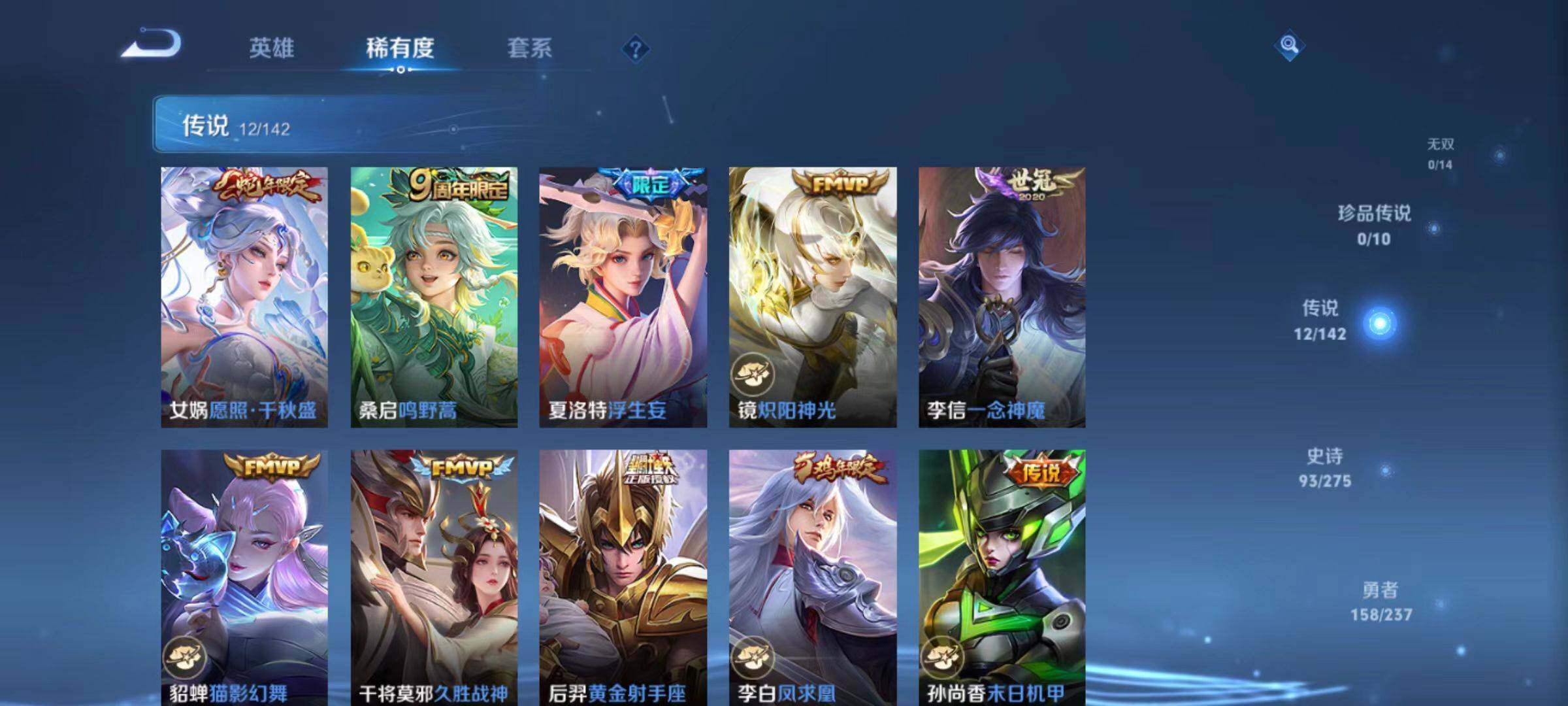 【传说皮肤】:女娲愿照千秋盛,桑启鸣野蒿,夏洛特浮生妄,镜炽阳神光,李信一念神魔,貂蝉猫影幻舞,干将莫邪久胜战神,后羿黄金射手座,李白凤求凰,孙尚香末日机甲,宫本武藏地狱之眼,孙悟空地狱火