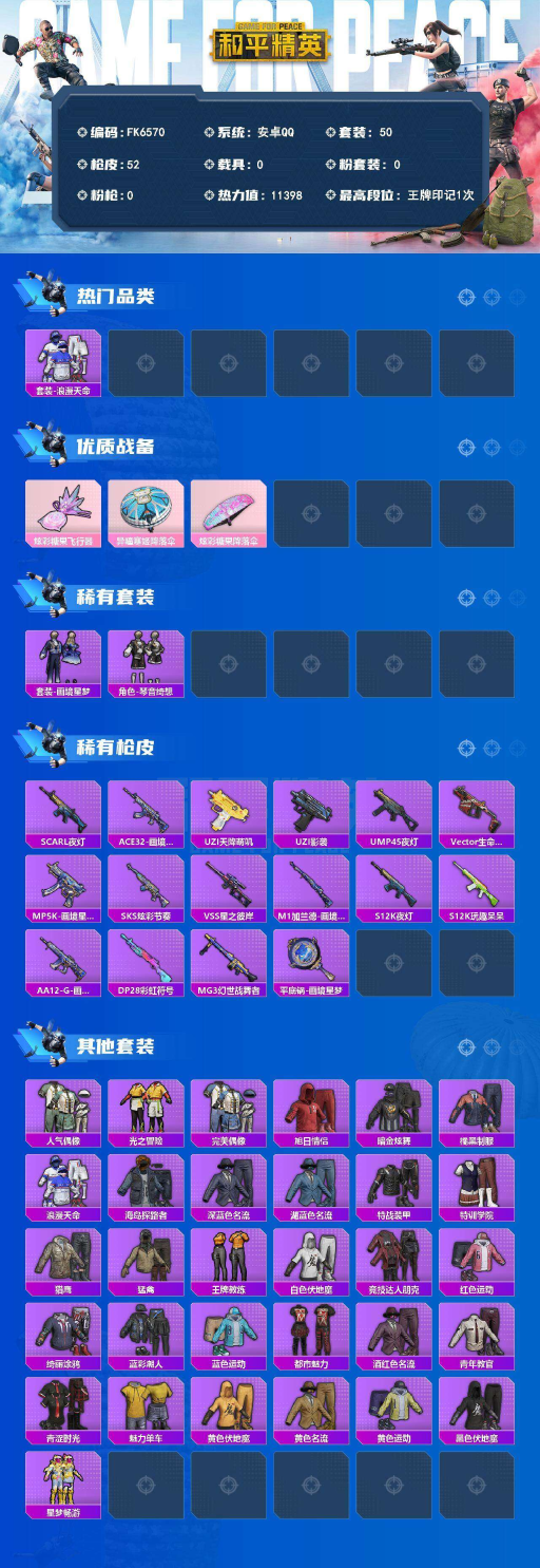 素材号-地铁48点满天赋-浪漫天命-炫彩糖果飞行器】安卓 手Q-0粉装-0特效枪-0载具-1粉色飞行器-11398热力值-1王牌印记-50套装-52枪皮 【热门品类】:套装-浪漫天命 【粉色飞行器】:炫彩糖果飞行器 【粉色降落伞】:异瞳寒姬降落伞,炫彩糖果降落伞 【稀有套装】:套装-炫彩糖果,套装-画境星梦,套装-琴音绮想 【稀有枪皮】:AUG-冰晶雪宝,SCAR-L-夜灯,A