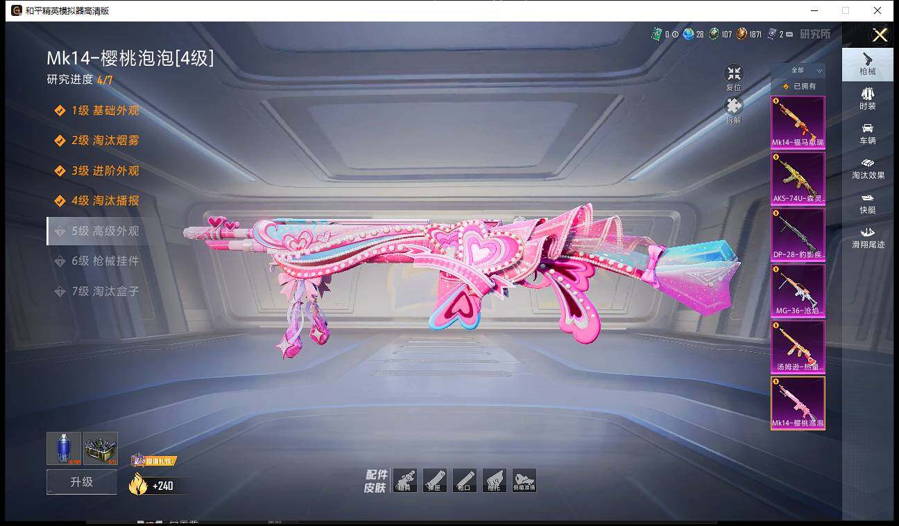 【粉色枪皮等级】:汤姆逊-热量炸弹(五级),AKS-74U-森灵之息(五级),Mk14-樱桃泡泡(四级),Mk14-福马献瑞(五级),DP-28-豹影疾电(五级),MG-36-沧焰双生(五级)