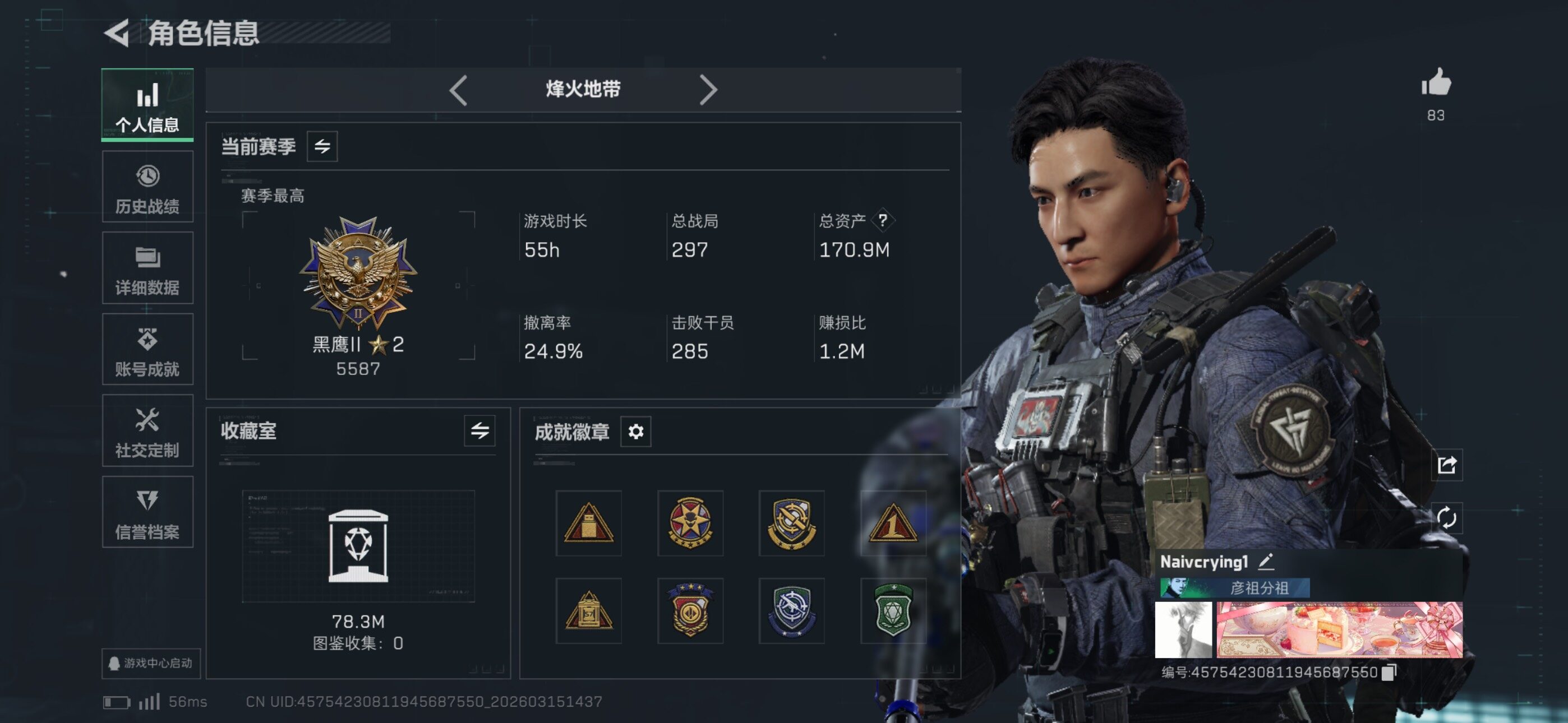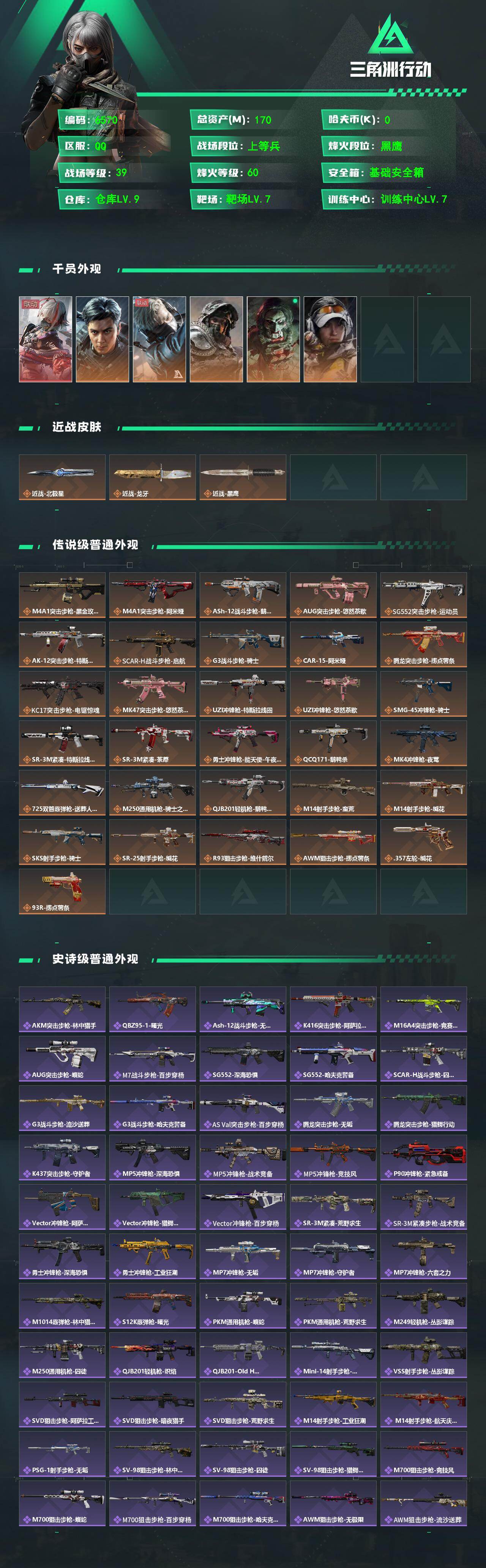 {特价出售}等级:60总资产:170.9M 纯币992 隐藏挂饰:2S黑夜猎手 红皮:骇爪-维什戴尔/威龙-飞虎 刀皮: 近战-北极星/近战-龙牙 特勤处:仓库9,训练7,靶场7 部门33333 蜂医-送葬人·无题密令,深蓝-不破誓约,红狼-电锯惊魂,露娜-金牌射手