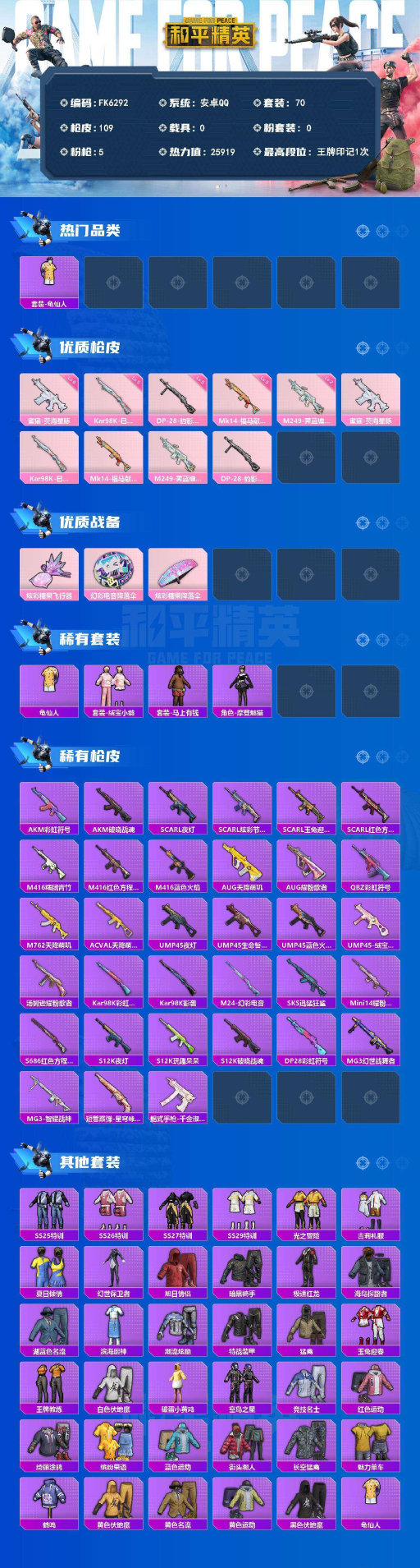 48点满天赋-5特效枪-六级蜜獾-荧海星豚-AUG-冰晶雪宝-M249-霁蓝缠春-身法素材号】 安卓 手Q-0粉装-5特效枪-0载具-1粉色飞行器-25919热力值-1王牌印记-70套装-109枪皮 【热门品类】:套装-龟仙人 【粉色枪皮等级】:蜜獾-荧海星豚(六级),Kar98K-巳巳如意(五级),Mk14-福马献瑞(五级),M249-霁蓝缠春(二级),DP-28-豹影疾电(