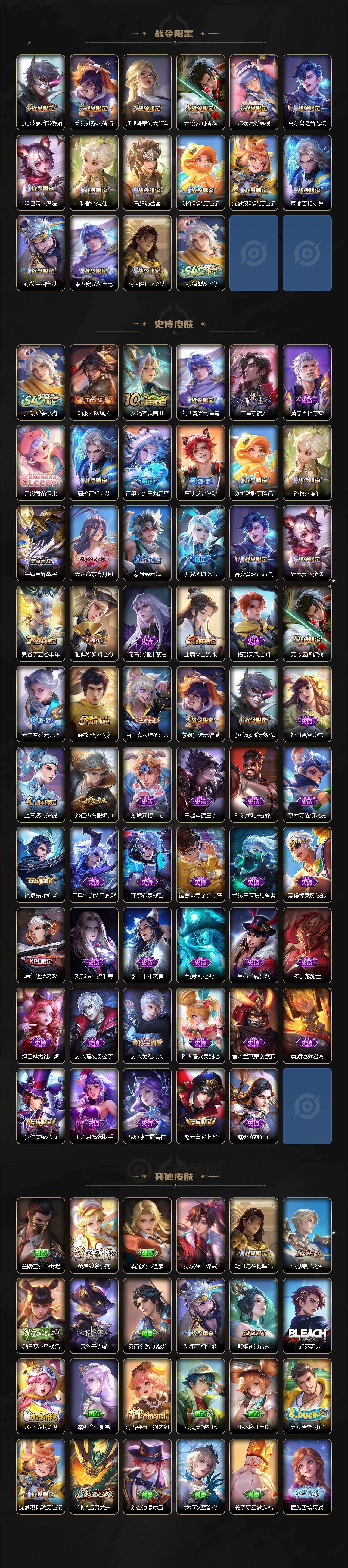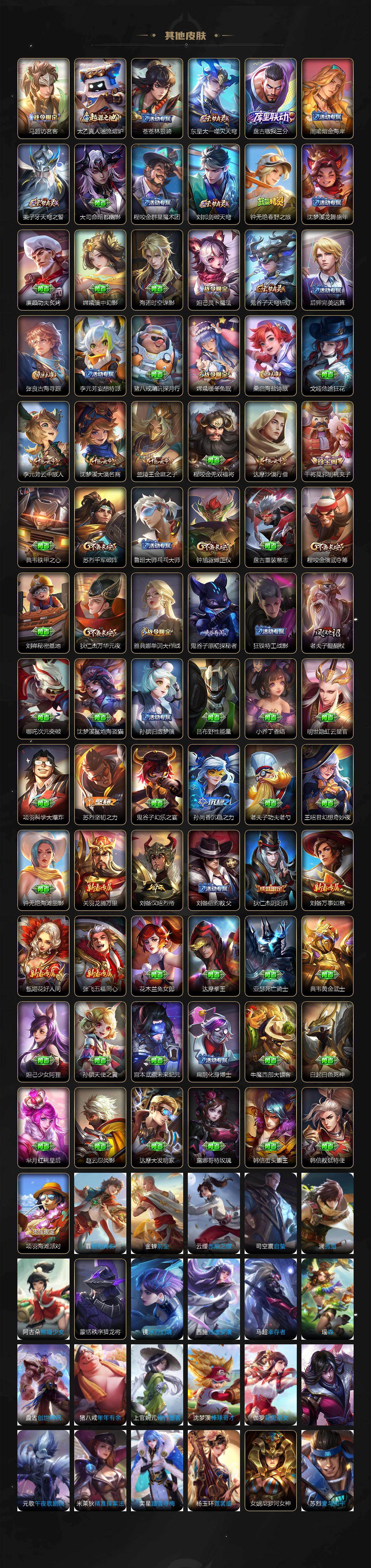 【限定皮肤】:蒙犽顽岩魄,姜子牙天穹之誓,狄仁杰阴阳师,赵云皇家上将,嬴政优雅恋人,庄周高山流水,元歌云间偶戏,马可波罗暗影游猎,狄仁杰魔术师,狄仁杰万华元夜,达摩沙漠行僧,项羽海滩派对,老夫子醍醐杖,程咬金演
