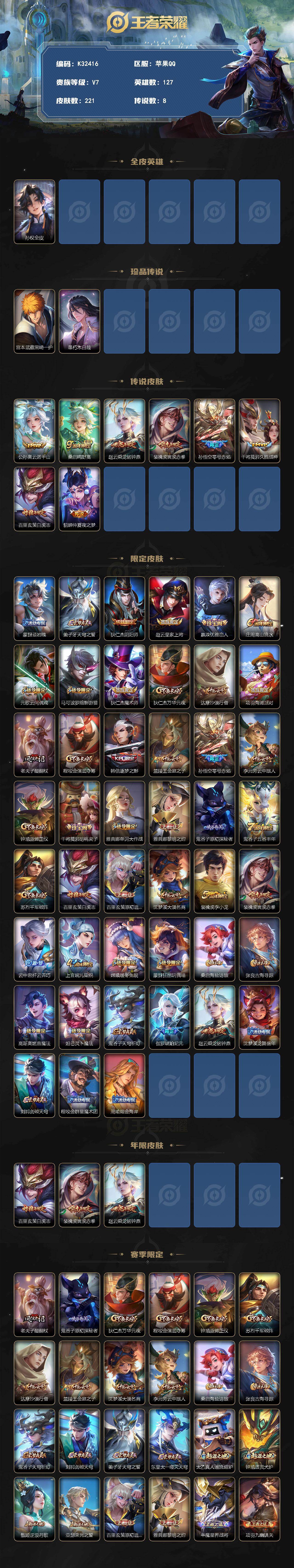 苹果Q-V7-最强王者段位-127英雄-221皮肤-2珍品传说-8传说-57史诗
