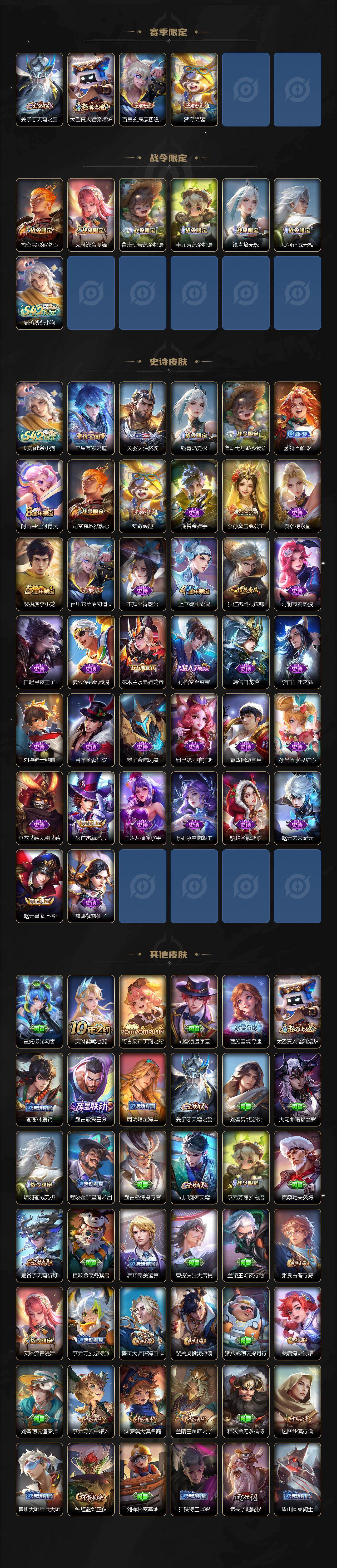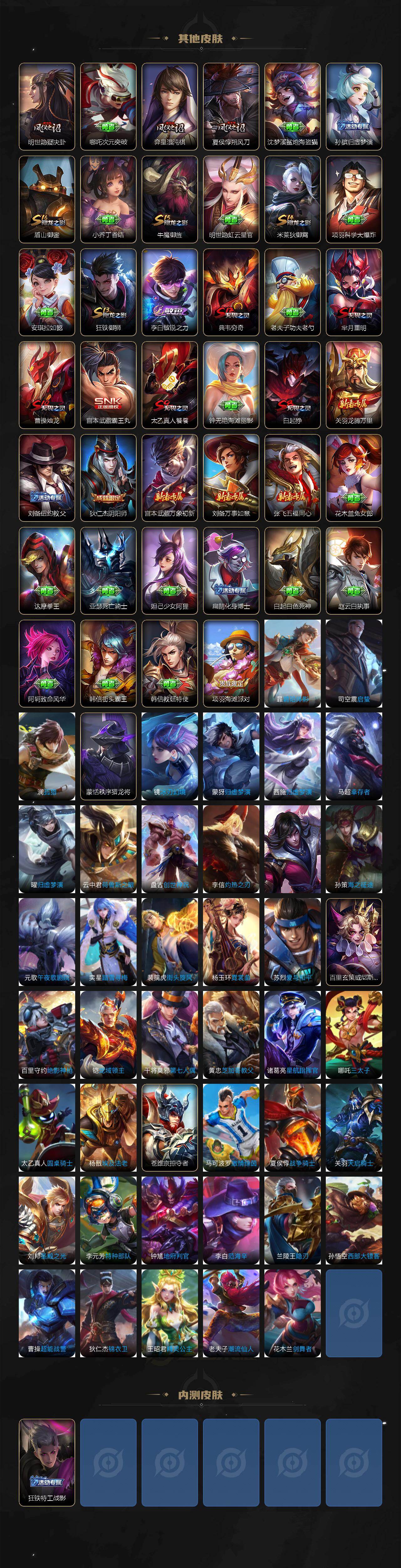 【限定皮肤】:白起狰,姜子牙天穹之誓,狄仁杰阴阳师,赵云皇家上将,芈月重明,吕布天魔缭乱,夏侯惇朔风刀,曹操烛龙,典韦穷奇,狄仁杰魔术师,达摩沙漠行僧,项羽海滩派对,老夫子醍醐杖,兰陵王金庭之子,孙悟空至尊宝,牛魔御旌,李元芳云中旅人,钟馗驱傩正仪,太乙真
