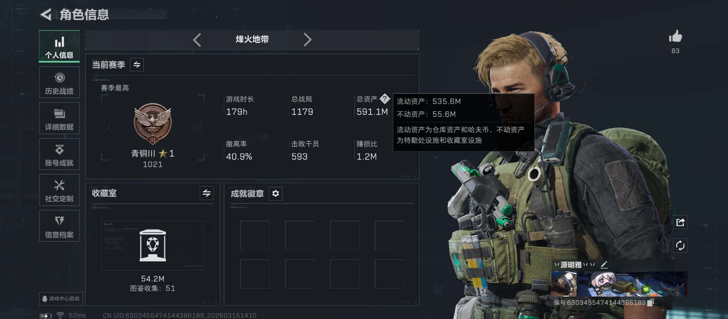 【高额资产账号591M,纯币231M,猛攻必备,纯绿号】【Q区三端互通】【无二次】YXz9306-特勤处:仓库9级/靶场7级/训练中心7级-总资产591m-哈夫币231m-烽火等级:60级