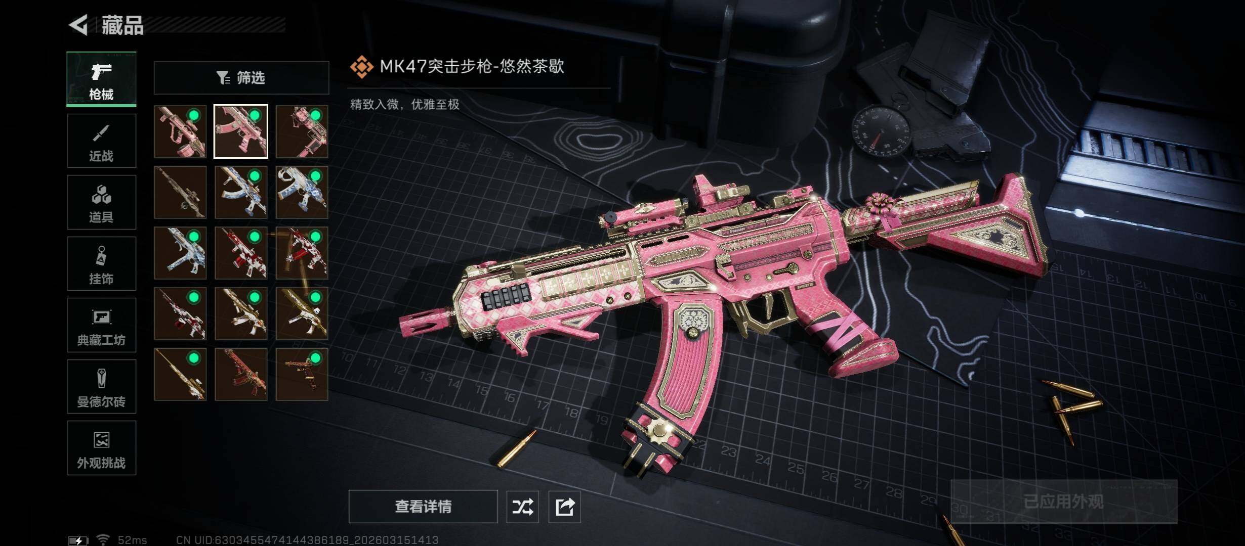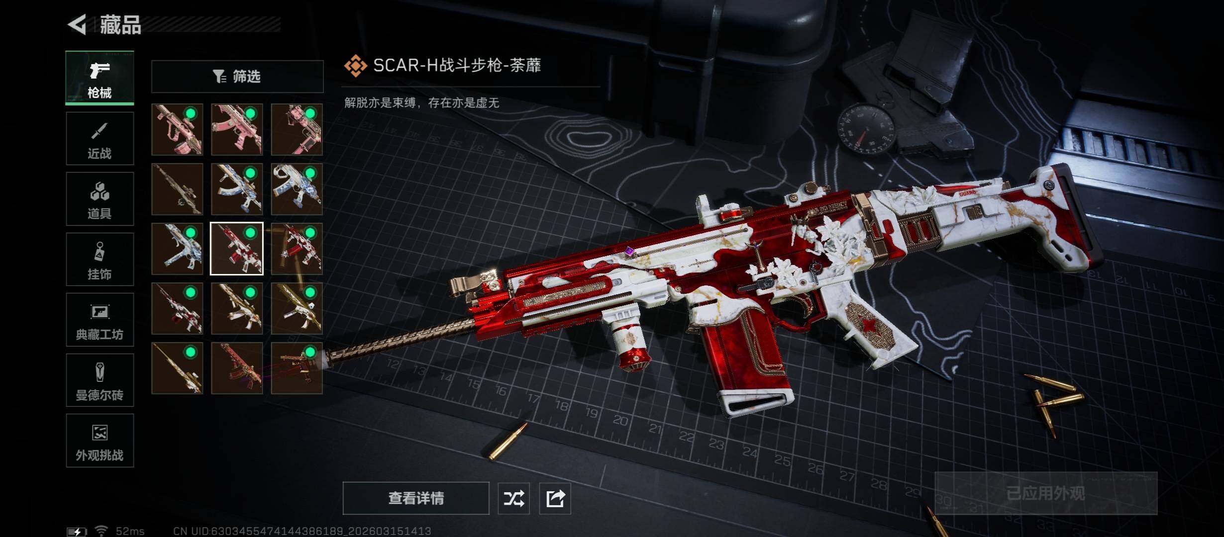 【传说外观】:AKM突击步枪-锦绣,AUG突击步枪-悠然茶歇,SCAR-H战斗步枪-荼蘼,腾龙突击步枪-马年祥瑞,腾龙突击步枪-万金泪冠,K437突击步枪-锦绣,M