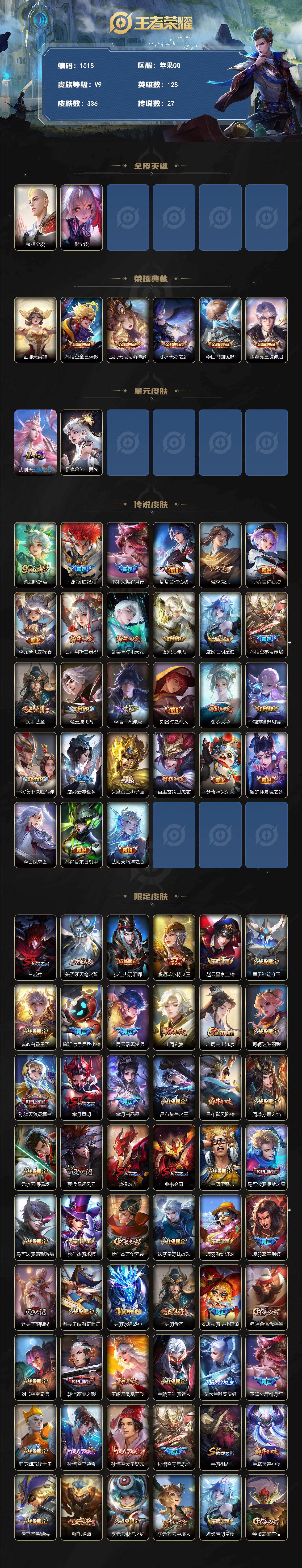 苹果Q-V8-最强王者段位-128英雄-336皮肤-5典藏皮肤-1典藏英雄-27传说-98史诗