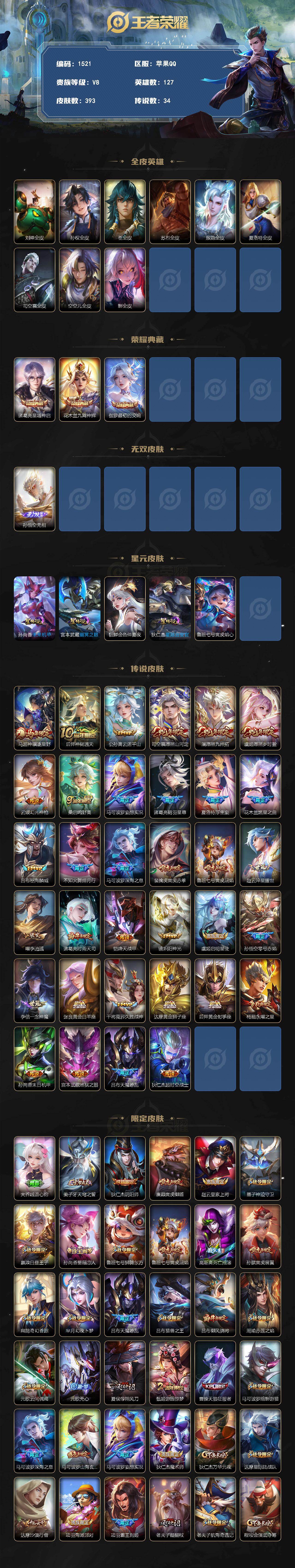 苹果Q-V8-最强王者段位-127英雄-393皮肤-3典藏皮肤-1无双-34传说