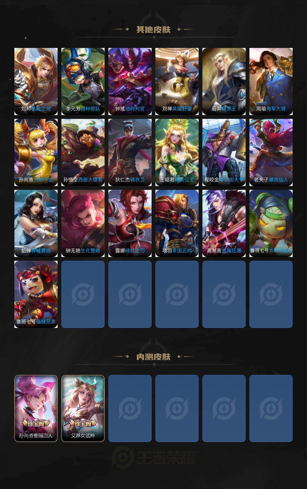 【英雄全皮】:刘禅全皮,孙权全皮,苍全皮,苏烈全皮,敖隐全皮,夏洛特全皮,司空震全皮,空空儿全皮,影全皮