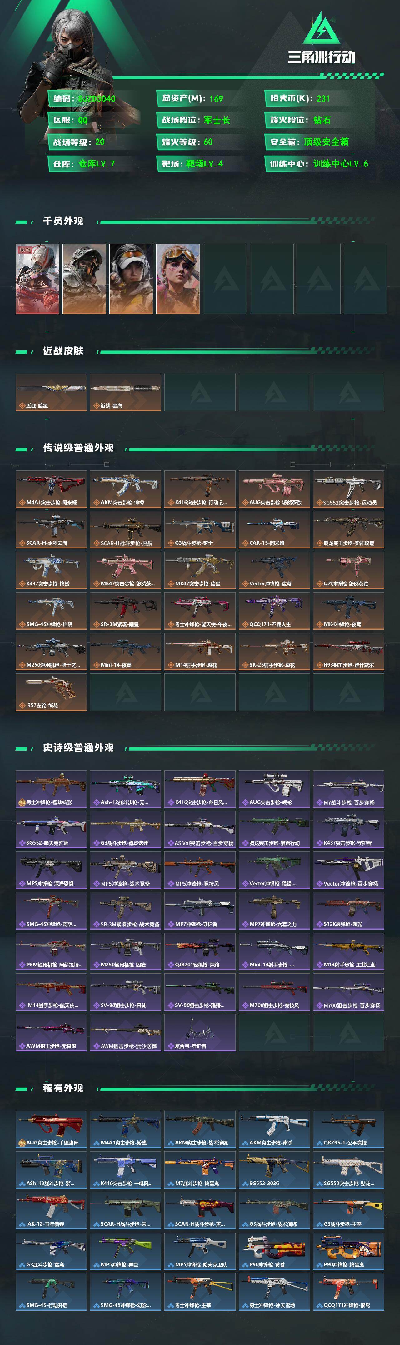 【SJZD3040】总资产(M):169M/哈夫币(K):231K/哈夫币(K):231K/传说枪皮数:26/全面战场等级:20_段位:军士长/烽火地带等级:60_段位:钻石/骇爪-维什戴尔/露娜-金牌射手/蛊-不羁人生/深蓝-不破誓约/近战-暗星/近战-黑鹰/M4A1突击步枪-阿米娅/AKM突击步枪-锦绣/K416突击步枪-行动记录/AUG突击步枪-悠然茶歇/SG552突击步枪-运动员/SCAR-H战斗步枪-水墨云图/SCAR-H战斗步枪-启航/G3战斗步枪-骑士/CAR-15突击步枪-阿米娅