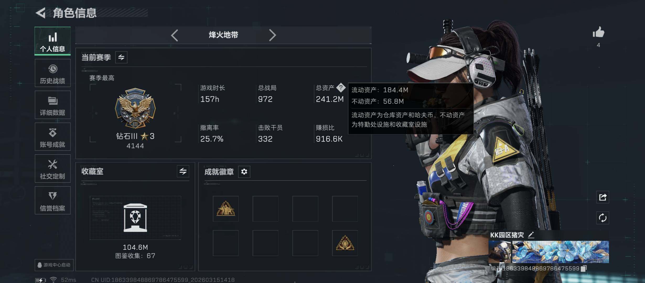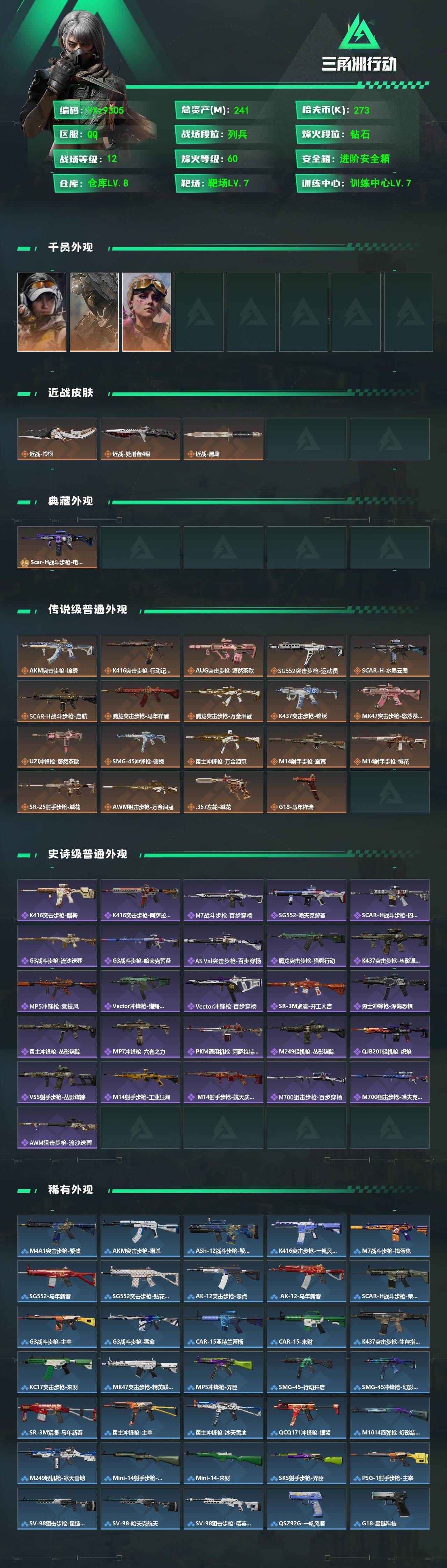 【裸怜悯刀皮+单典藏皮肤·资产241M】【Q区三端互通】【【无二协助处理】】YXz9305-特勤处:仓库级/靶场级/训练中心级-总资产241m-哈夫币27w-烽火等级:60级