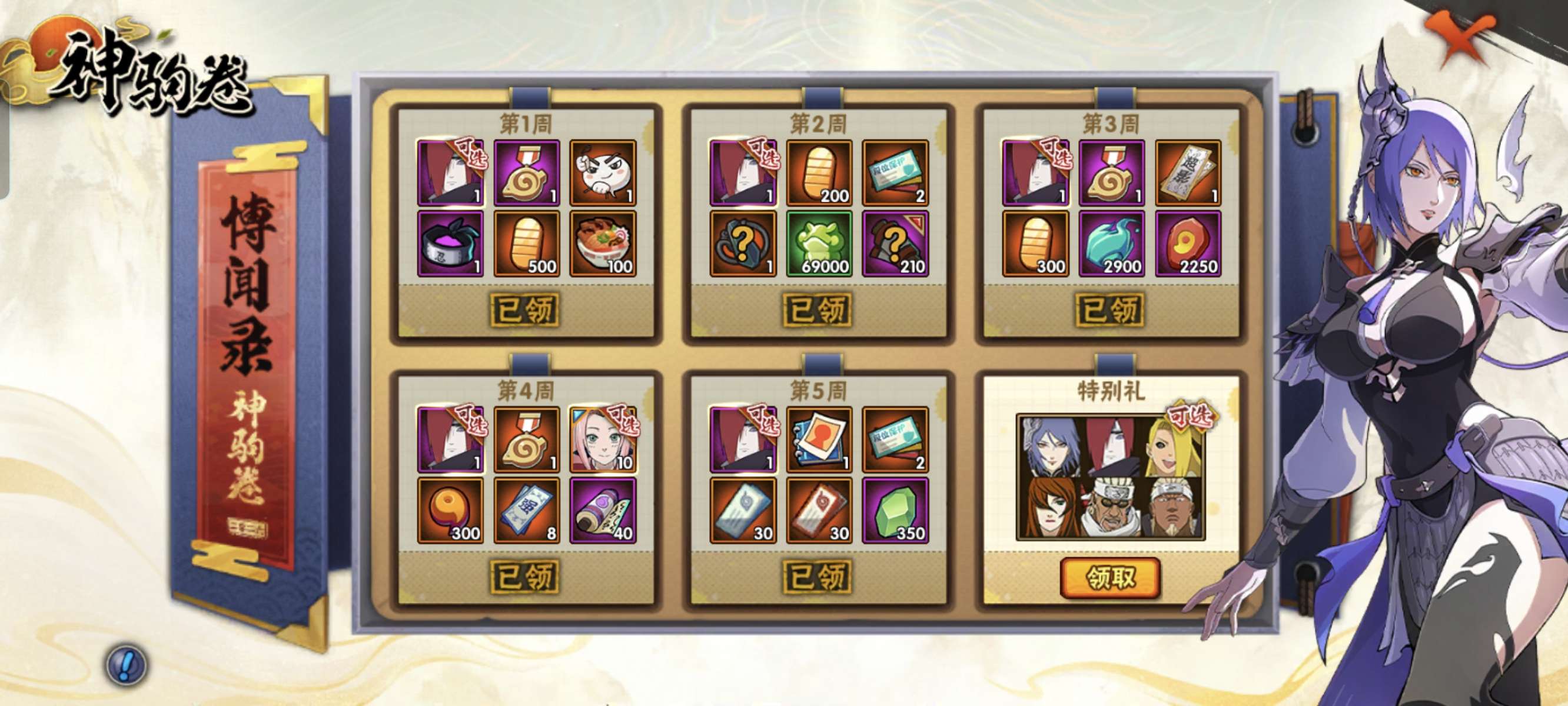 2w2金币+120高招券,晓蛇咒印佐助,博闻录自选,超影7天没领,免费改名没用