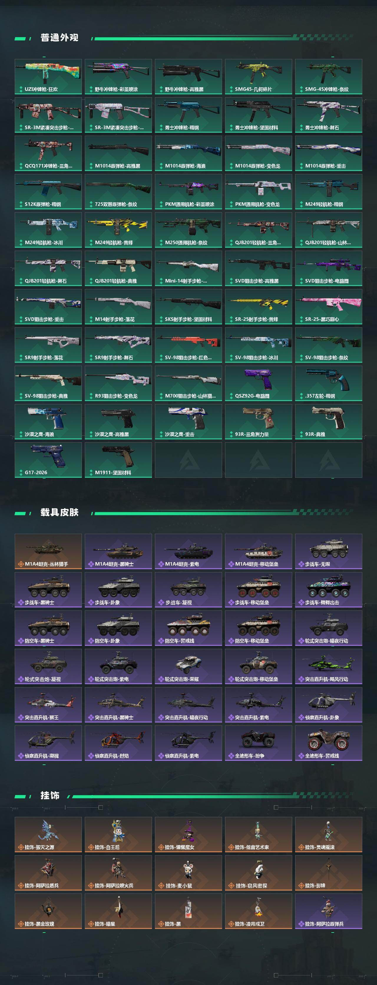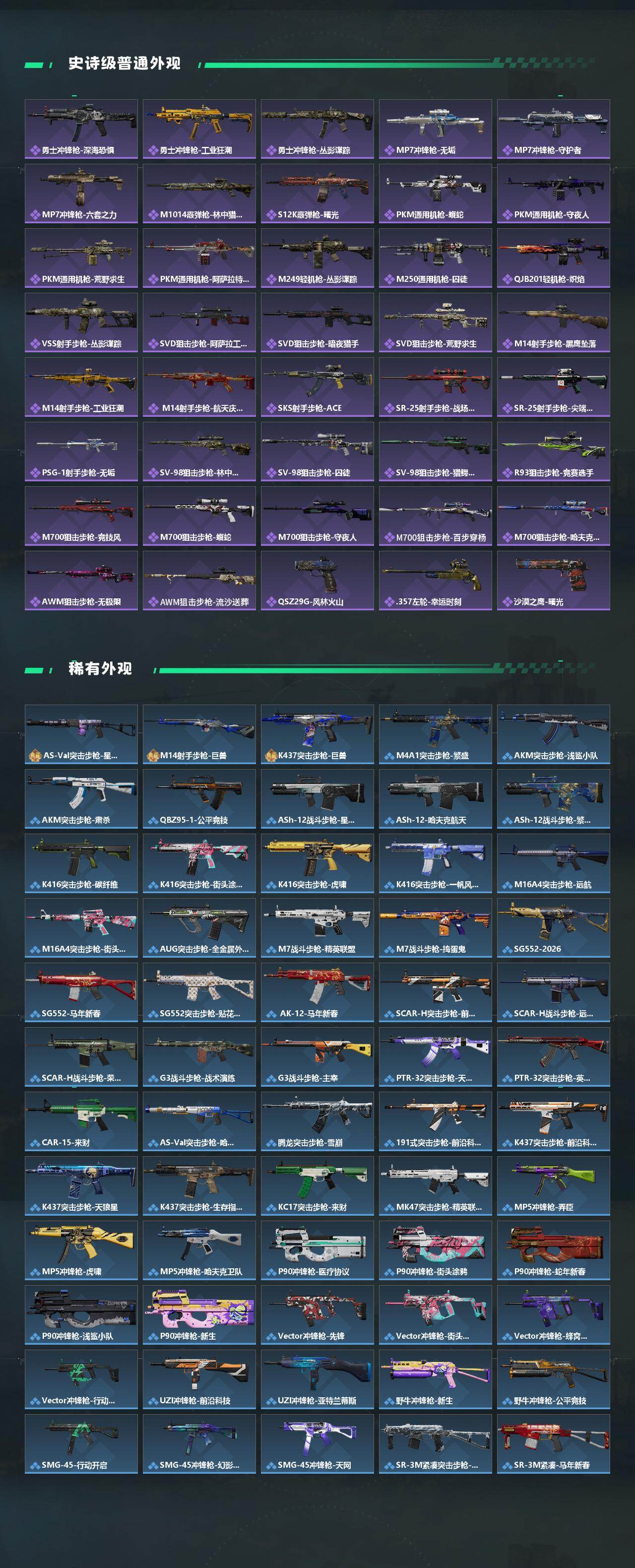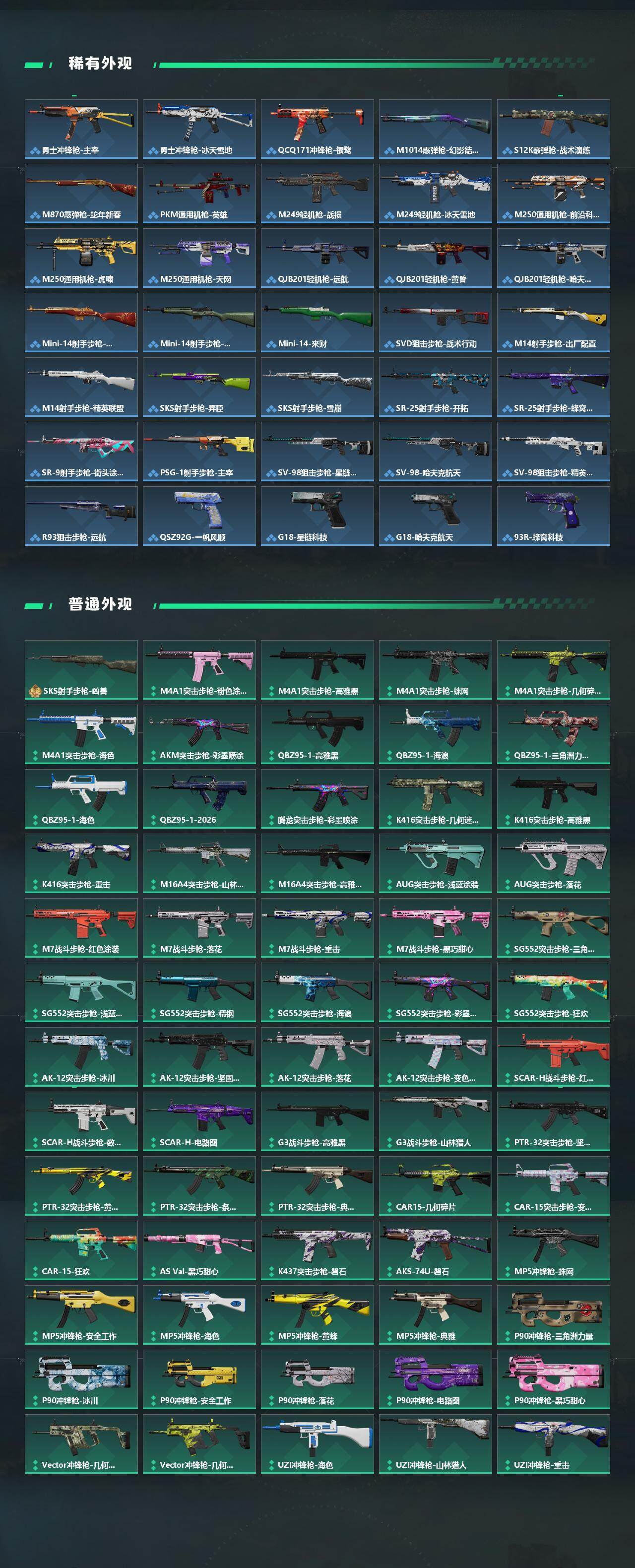 【传说外观】:M4A1突击步枪-蚀金玫瑰,M4A1突击步枪-阿米娅,AKM突击步枪-锦绣,QBZ95-1突击步枪-凌霄戍卫,K416突击步枪-行动记录,AUG突击步枪-悠然茶歇,M7战斗步枪-