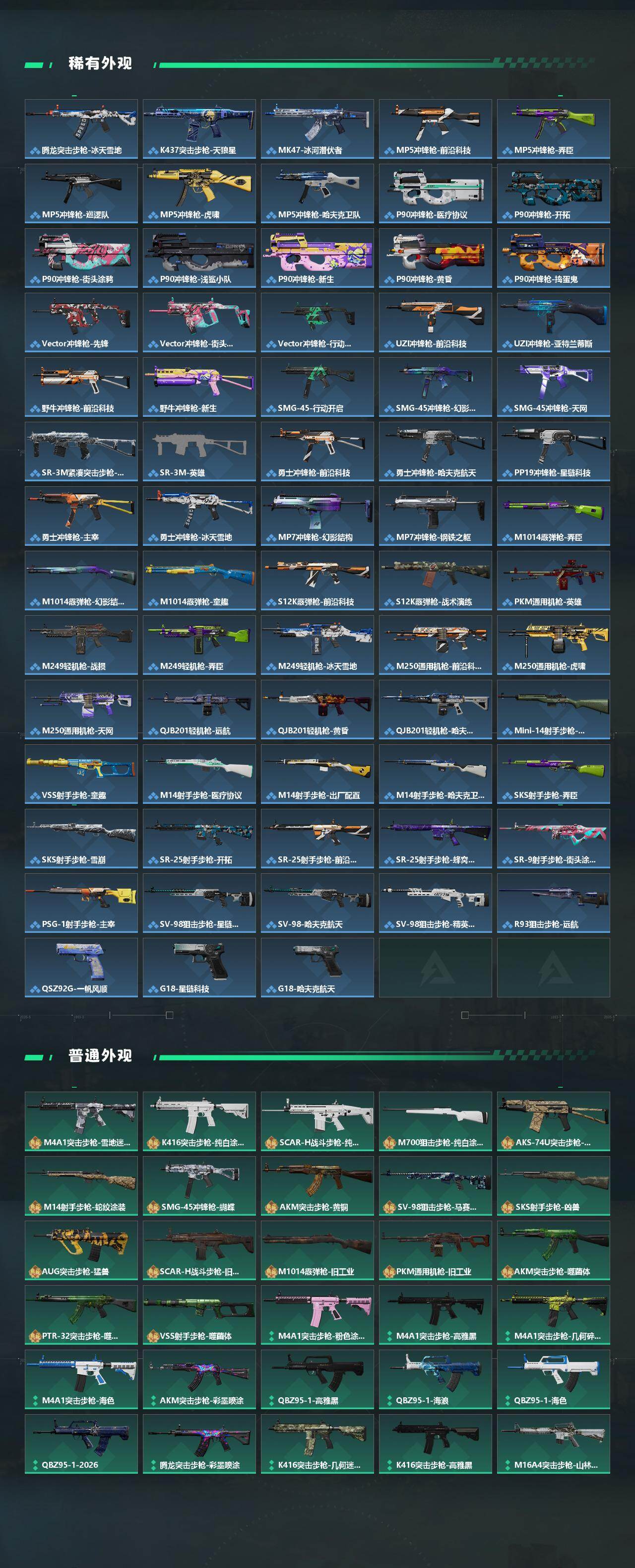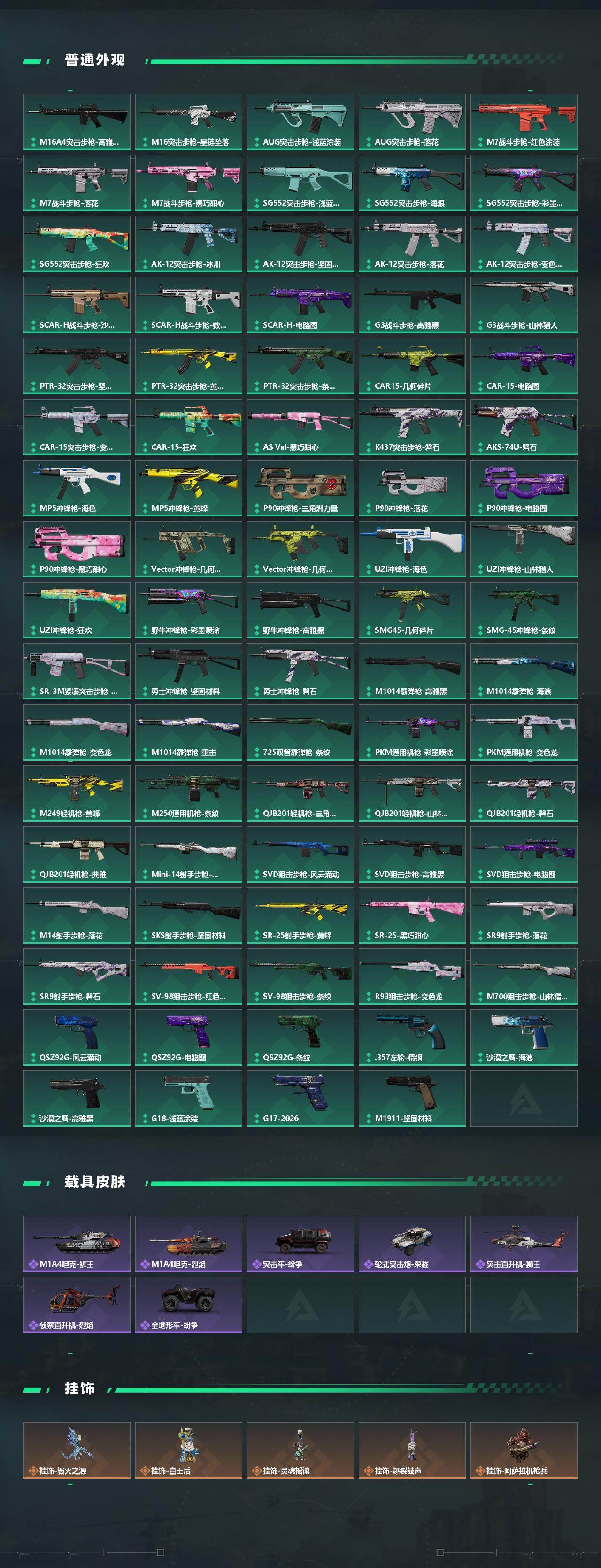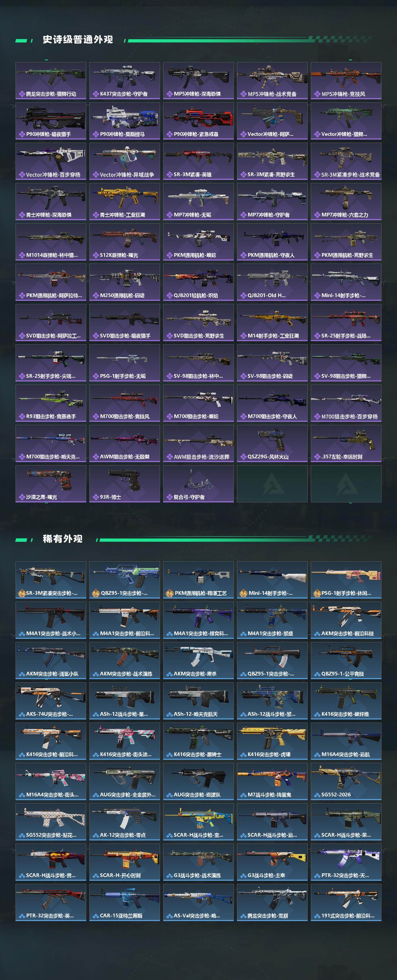 【传说外观】:M4A1突击步枪-黑暗力量,M4A1突击步枪-蚀金玫瑰,M4A1突击步枪-阿米娅,AKM突击步枪-锦绣,QBZ9