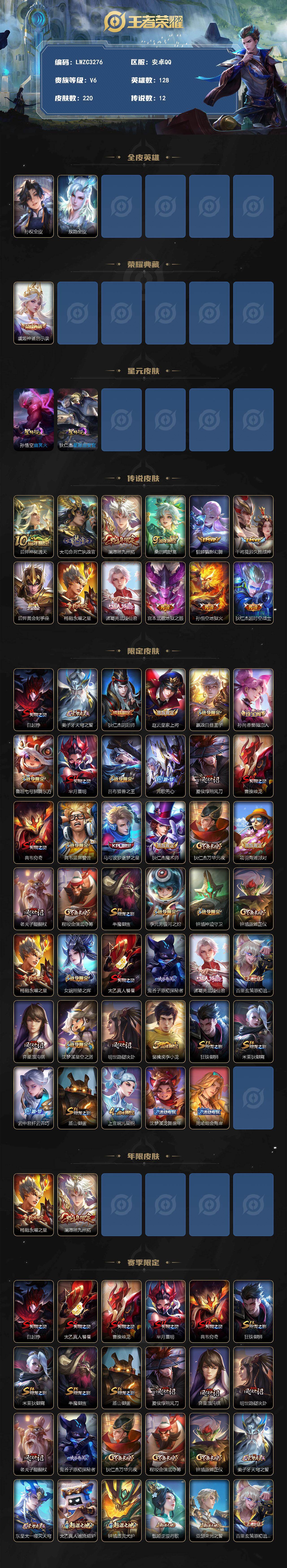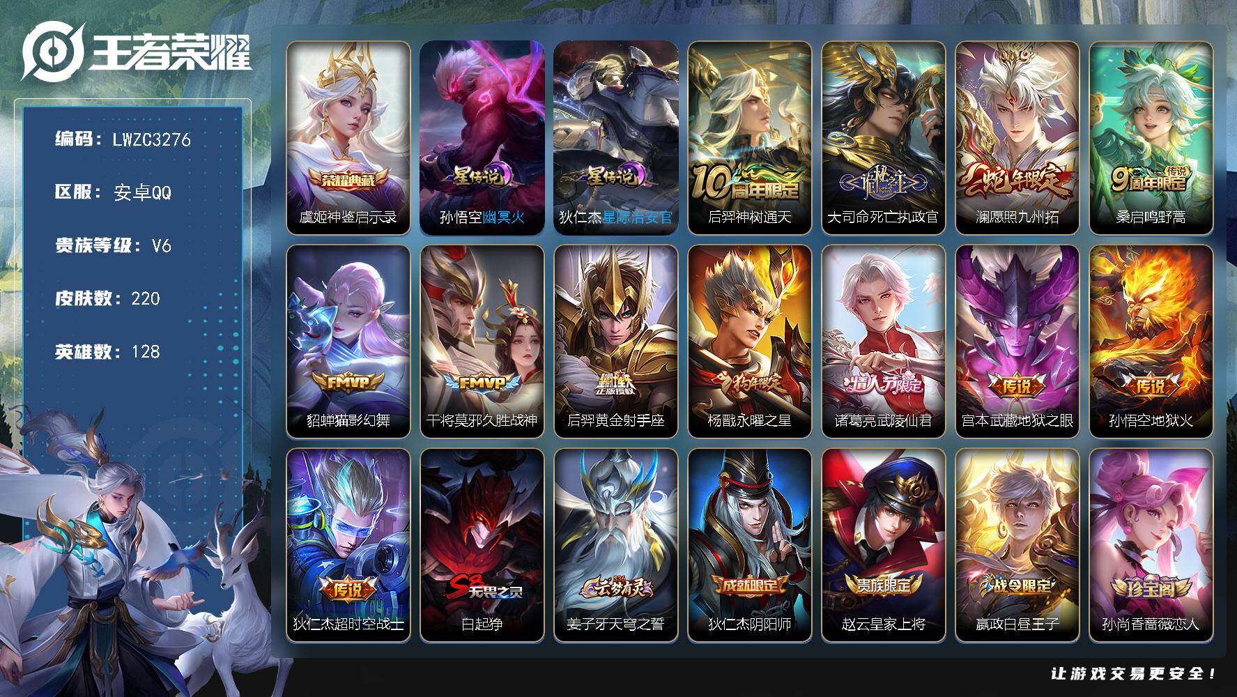 【特价出售/店主推荐/1市标】:安卓Q-V7-至尊星耀III段位-128英雄-220皮肤-1典藏皮肤-2星元-12传说-46史诗【英雄全皮】:孙权全皮,敖隐全皮【荣耀典藏】:虞姬神鉴启示录【传说皮肤】:后羿神树通天,大司命死亡执政官,澜愿照九州拓,桑启鸣野蒿,貂蝉猫影幻舞,干将莫邪久胜战神,后羿黄金射手座,杨戬永曜之星,诸葛亮武陵仙君,宫本武藏地狱之眼,孙悟空地狱火,狄仁杰超时空战士【限定皮肤】:白起狰,姜子牙天穹之誓,狄仁杰阴阳师,赵云皇家上将,嬴政白昼王子,孙尚香蔷薇恋人,鲁班七号狮舞东方,