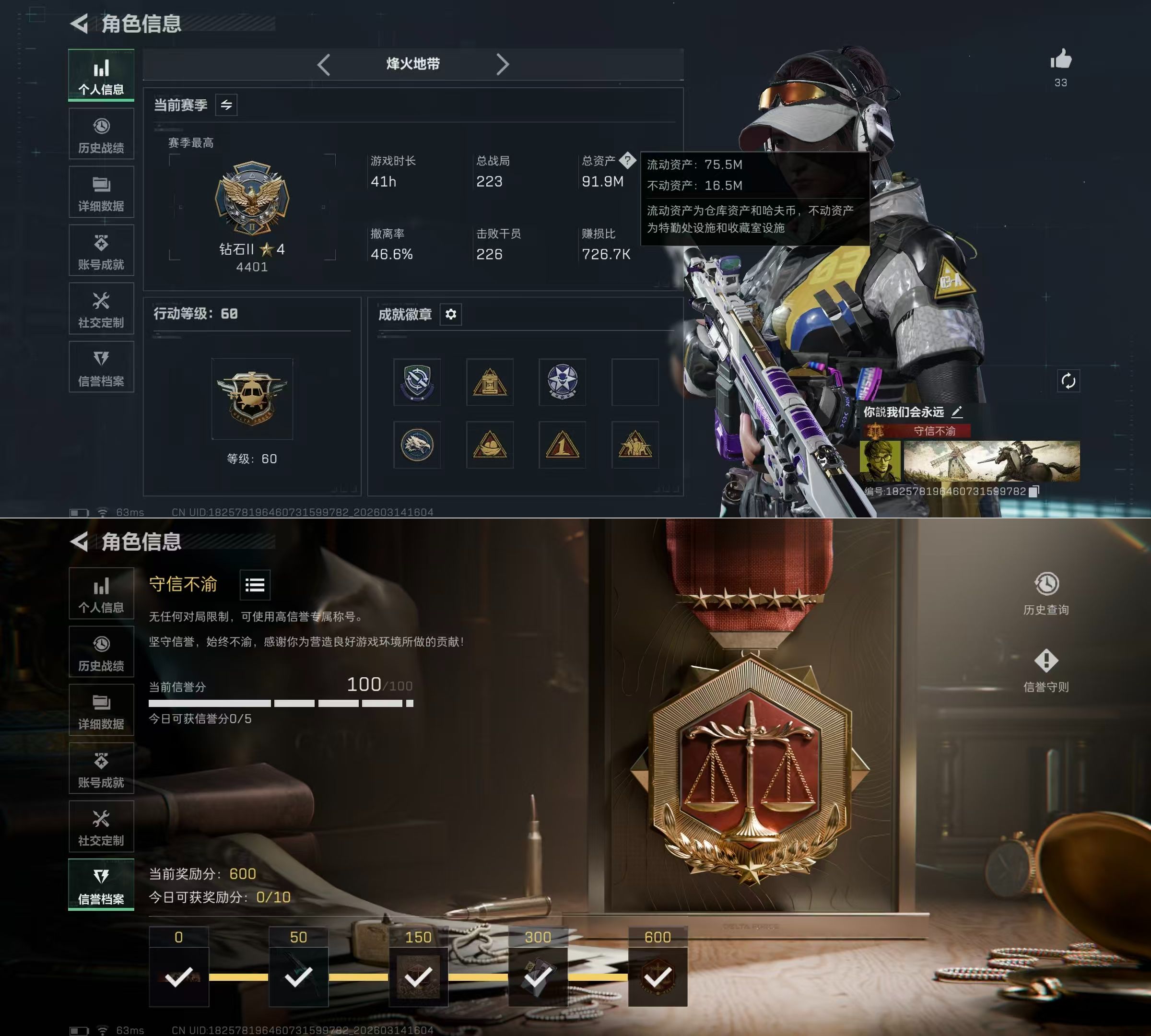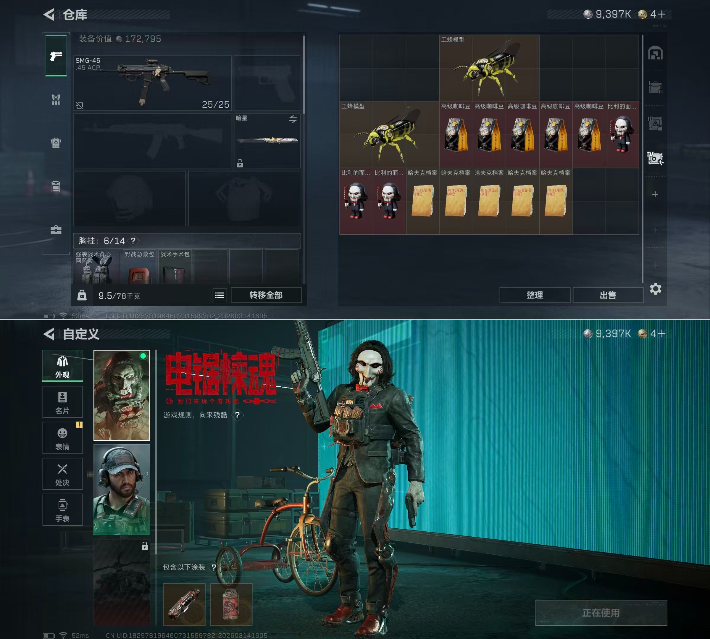 DSJZ1794【极品三刀皮电锯惊魂 处刑者 暗星】【总资产(M)】92.09【哈夫币】9,397.66【行动等级】60【烽火地带段位】钻石