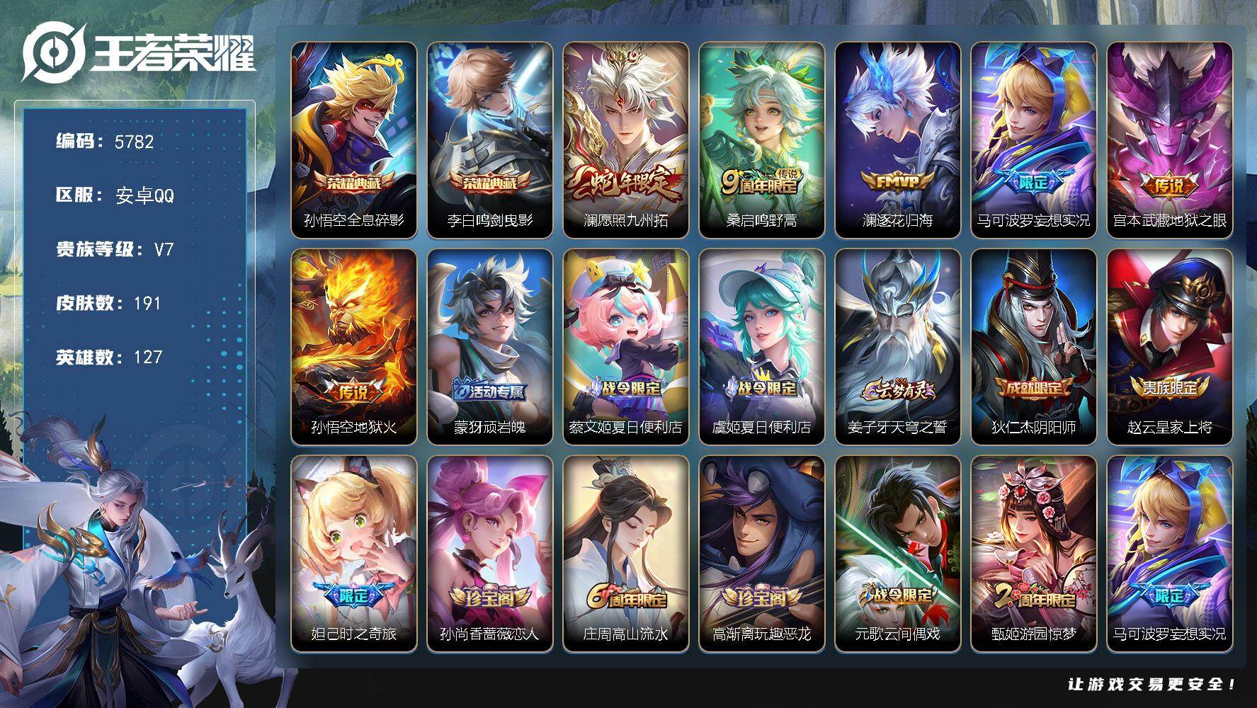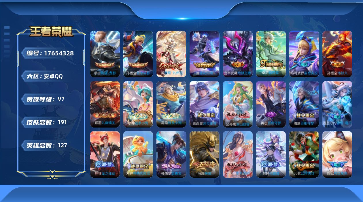728-[17654328]可二次 贵族7-贵族积分22614-191皮2典藏6传说0无双 安卓手Q431区191皮2典藏6传说0无双V7 营地ID1783703279非凡王者【荣耀典藏】:鸣剑·曳影,全息碎影【优质限定皮肤】:至尊宝,神威【传说皮肤】:地狱火,地狱之眼,逐花归海,妄想实况,愿照·九州拓,鸣野蒿【史诗皮肤】:曙光守护者,线条小狗,九幽镇关,天秀·启明,光弋星穹,特工魅影,游园惊梦,德古拉伯爵,无限星赏官,云间偶戏,百相守梦,涂山容容,至尊宝,冰冠公主,百相守梦,节奏热浪,暗夜