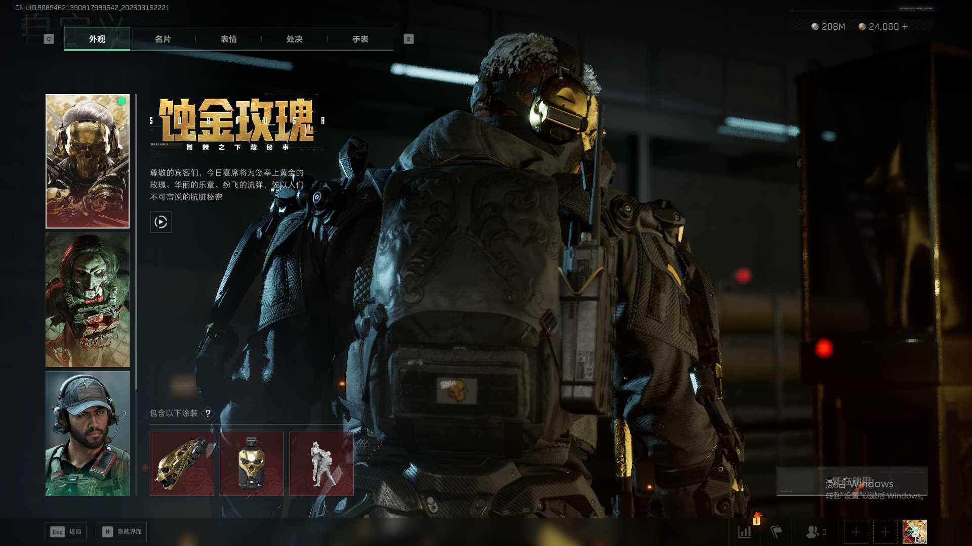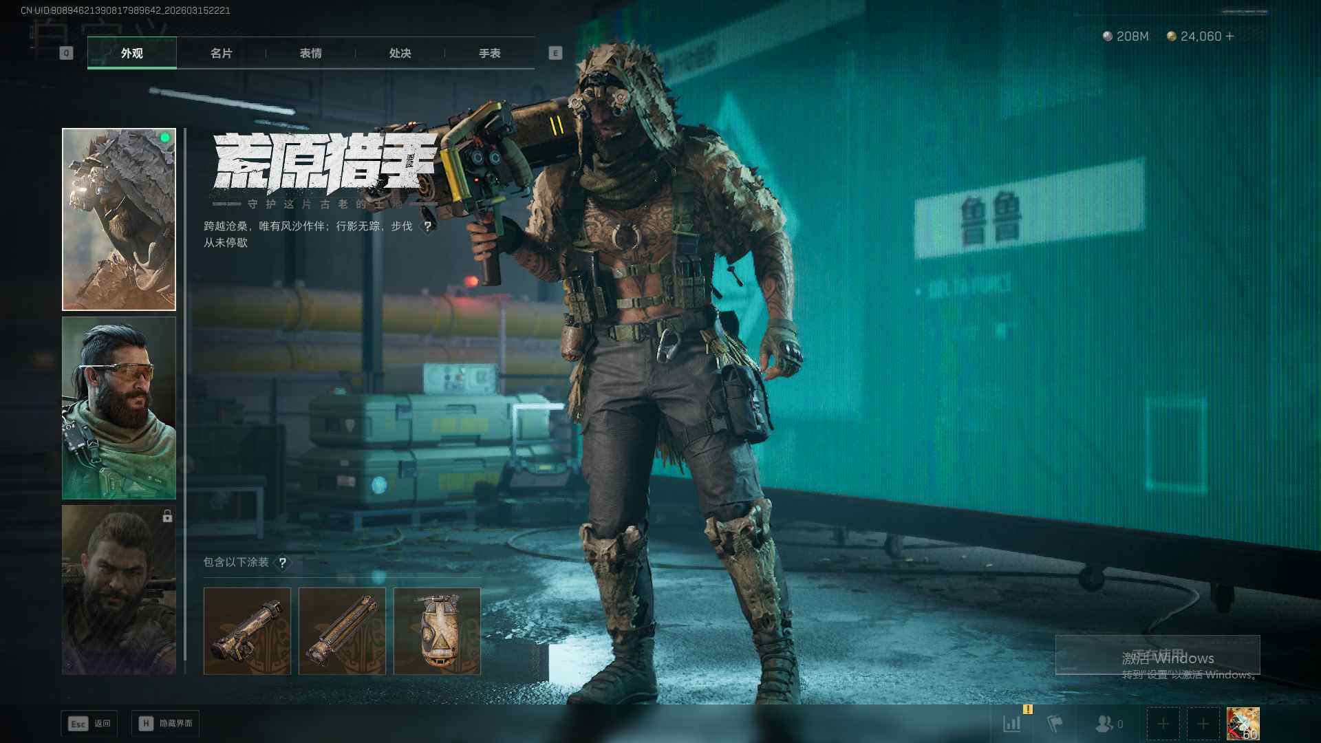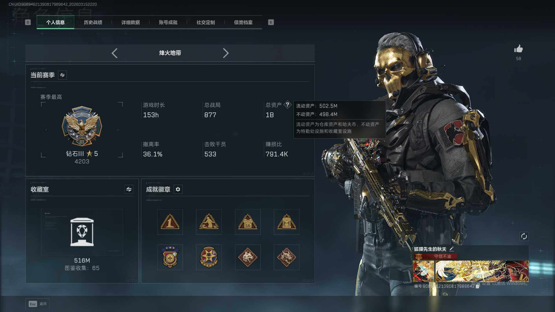 总资产(M):1000M/哈夫币(K):208121K/传说枪皮数:49/全面战场等级:50_段位:军士长/烽火地带等级:60_段位:钻石/