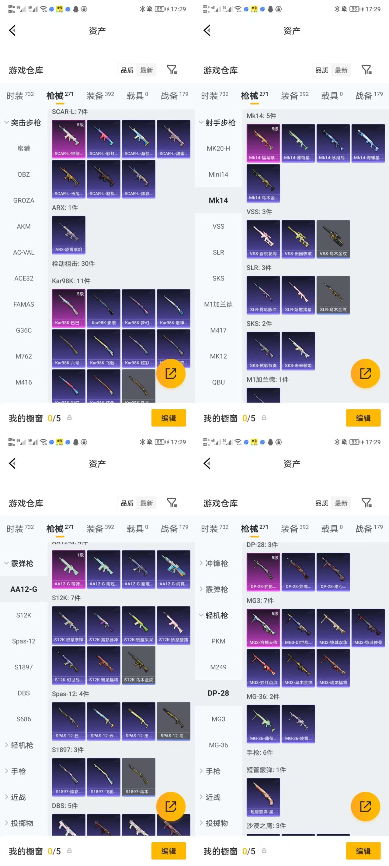 【10特效枪】AKM-梦之光华[7级],Mk14-福马献瑞[5级],Kar98K-巳巳如意[5级],SCAR-L-锦绣绵绵[5级],DP-28-豹影疾电[5级],M416-心之恋语[7级],M762-甜蜜誓约[7级],GROZA-巴